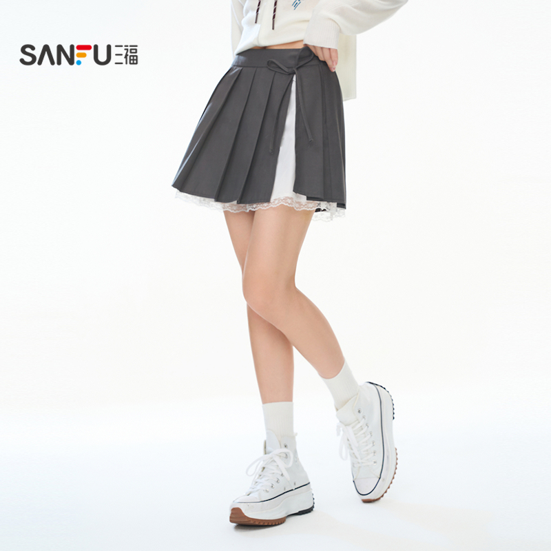 507467 绑带蕾丝摆半身裙a字双层百褶裙女装 三福短裙2025新款 秋季