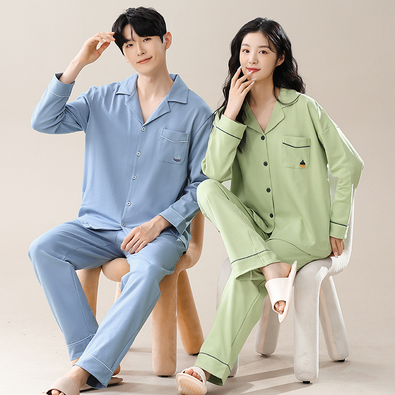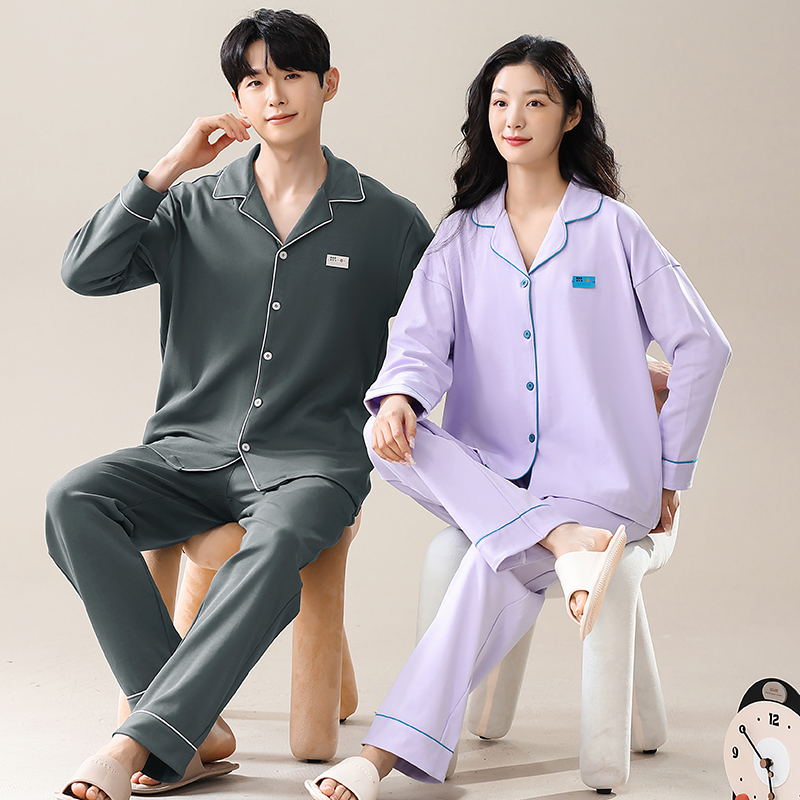 带口袋休闲男女纯棉家居服 翻领开衫 俞兆林全棉情侣睡衣春秋款 长袖