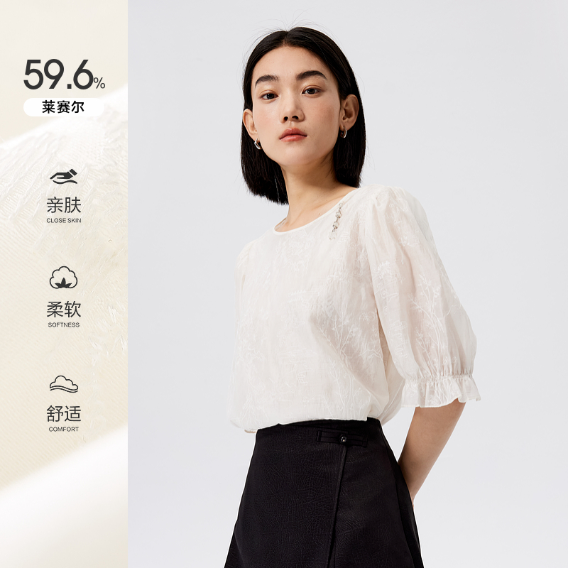 新款 天丝上衣莱赛尔2025秋季 T恤女新中式 水云间白色国风刺绣短袖