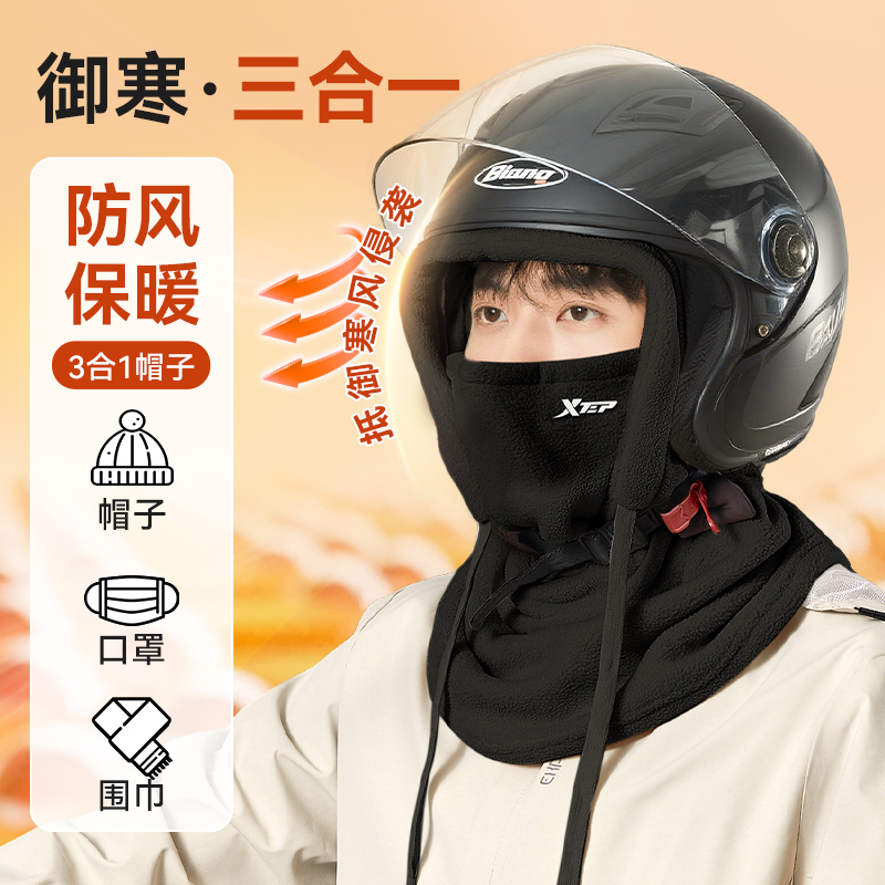 特步防寒连帽围脖一体骑行骑车保暖帽子秋冬季 骑行女防风面罩 男款