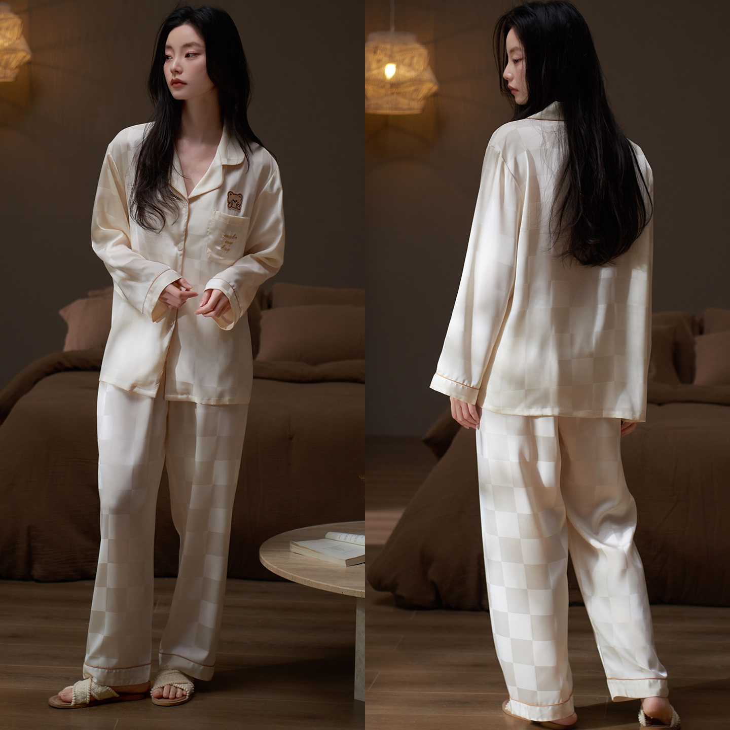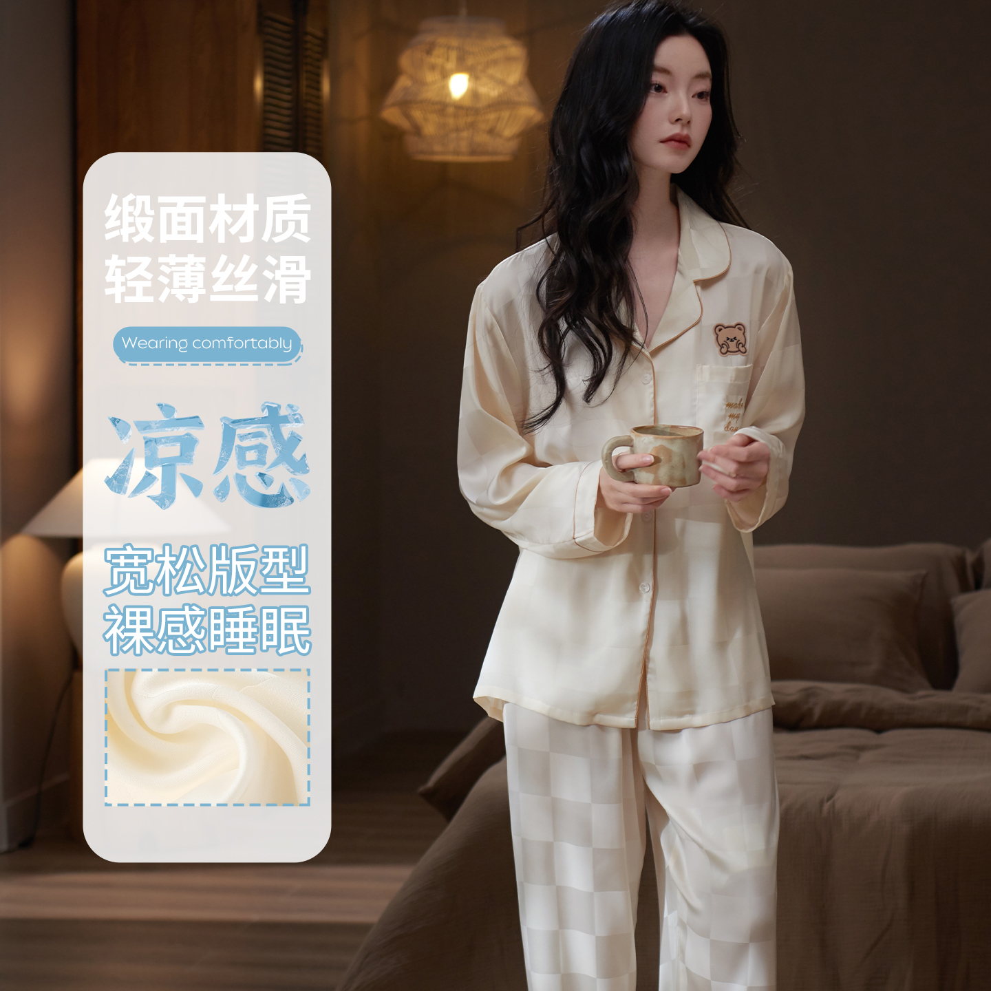 套装 柔软冰丝春夏天家居服可爱小熊开衫 长袖 乐姿梦睡衣女士春秋季