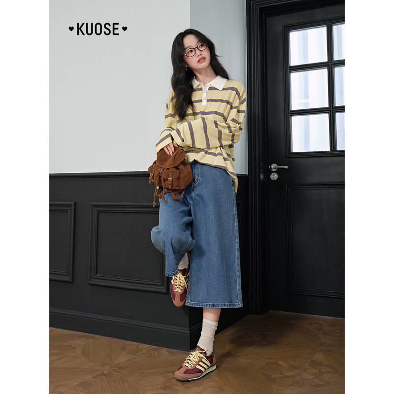 穿搭新款 2025秋冬季 女宽松上衣 t恤翻领休闲美式 阔色黄色条纹长袖