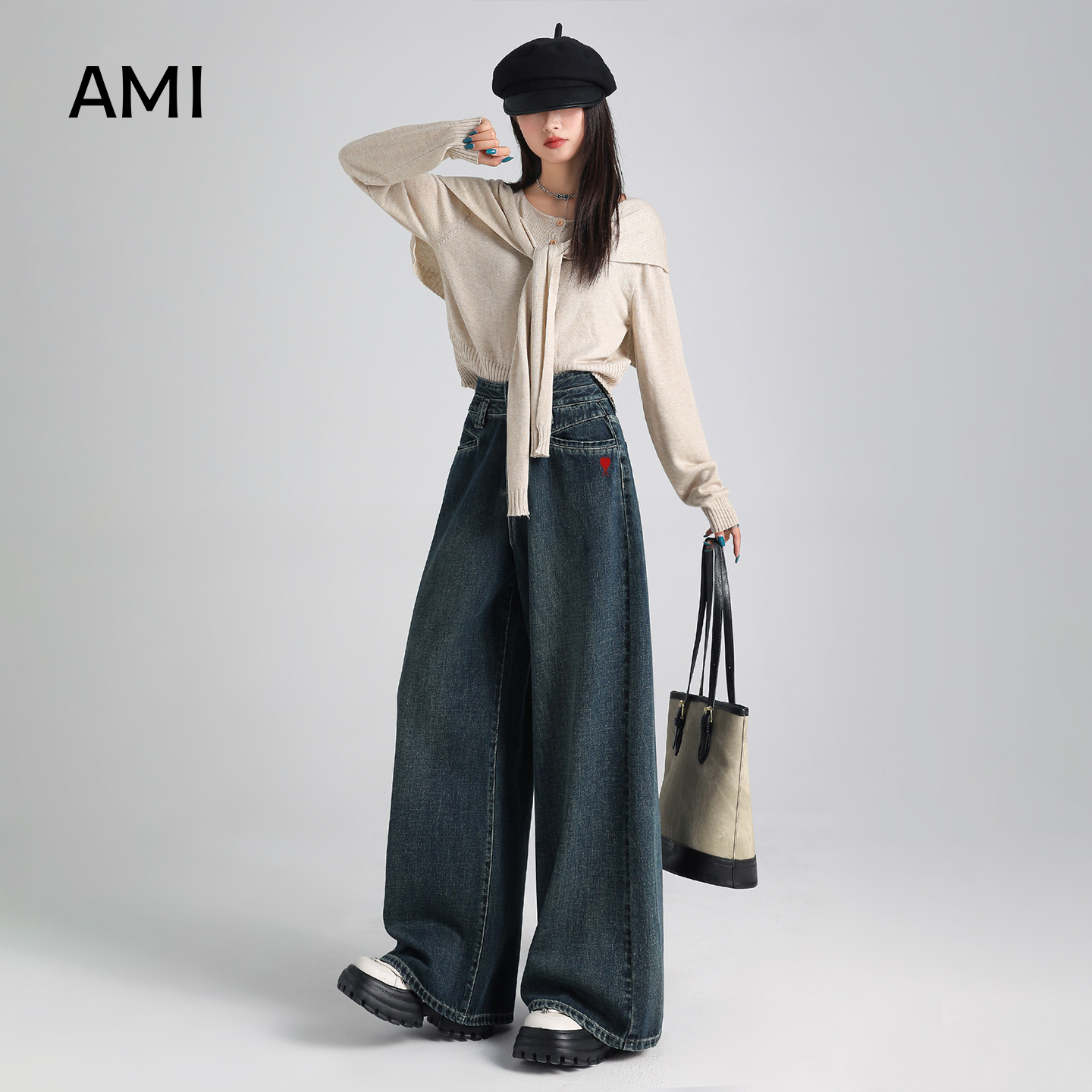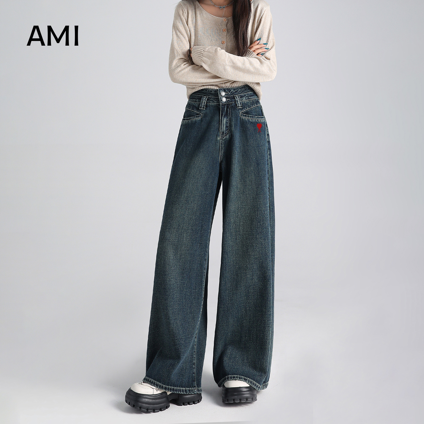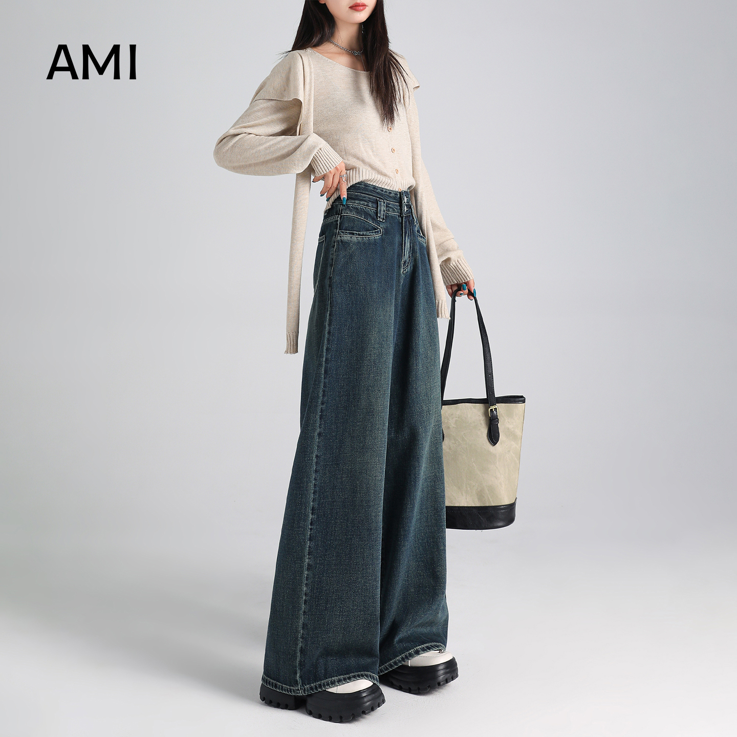 House 复古做旧阔腿裤 百家好垂感高腰牛仔弯刀裤 新款 女秋季 Basic