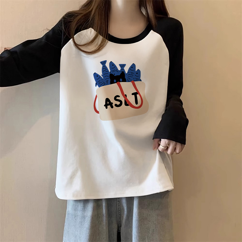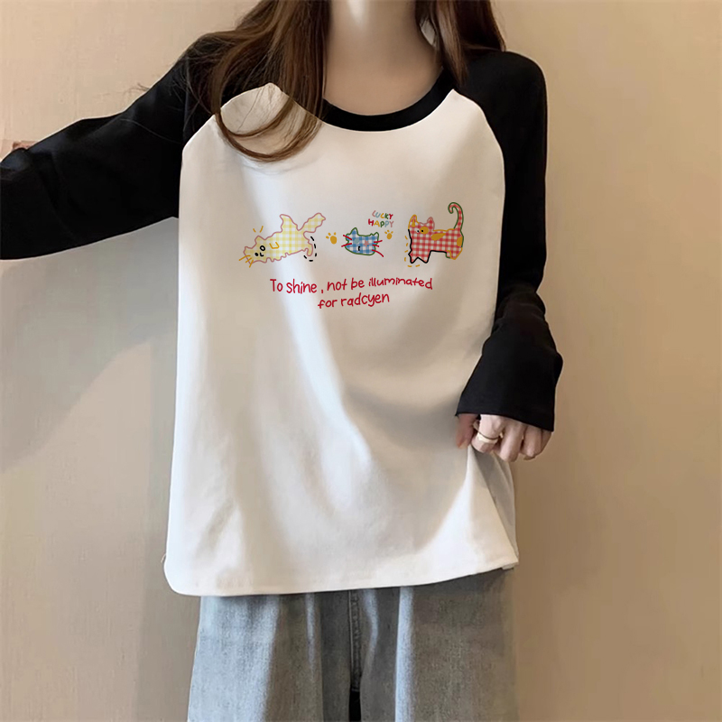 女装 纯棉早秋长袖 撞色休闲宽松上衣胖mm大码 插肩袖 t恤女2025新款
