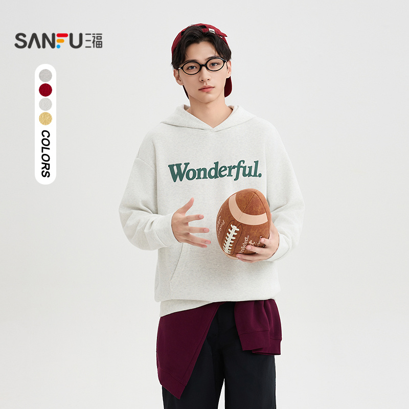 三福2025冬季 大字母印花卫衣男休闲连帽口袋宽松上衣510118 新款