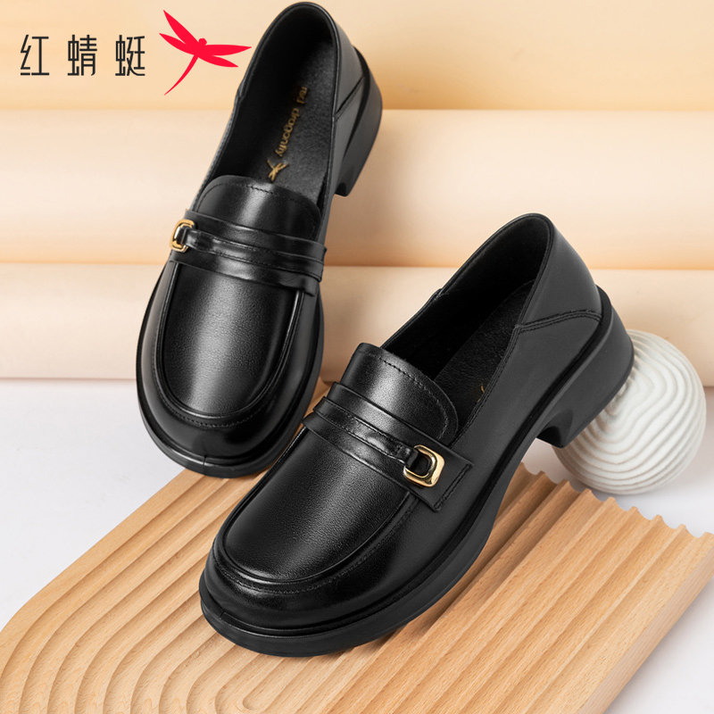 一脚蹬中跟通勤两穿单鞋 真皮英伦风小皮鞋 女 厚底乐福鞋 红蜻蜓女鞋