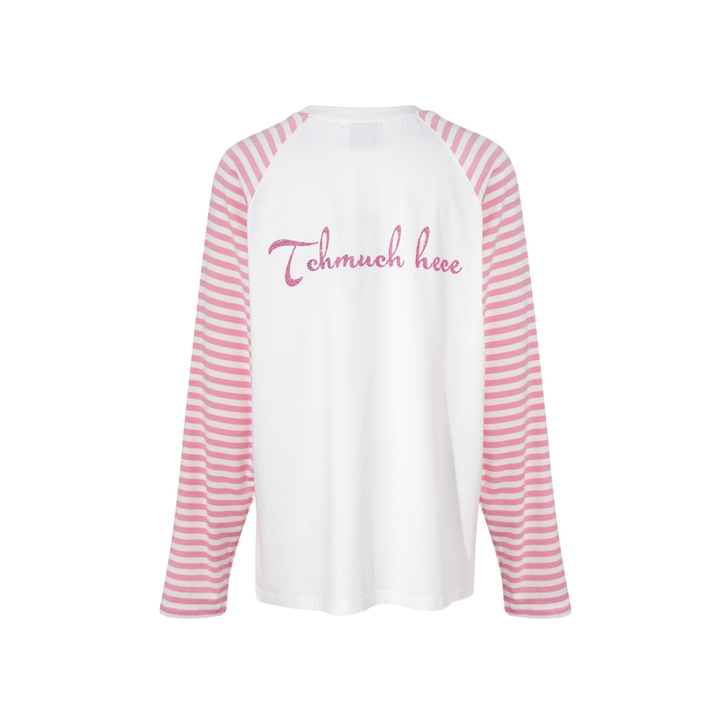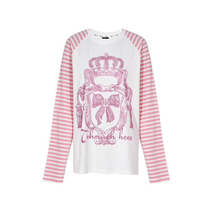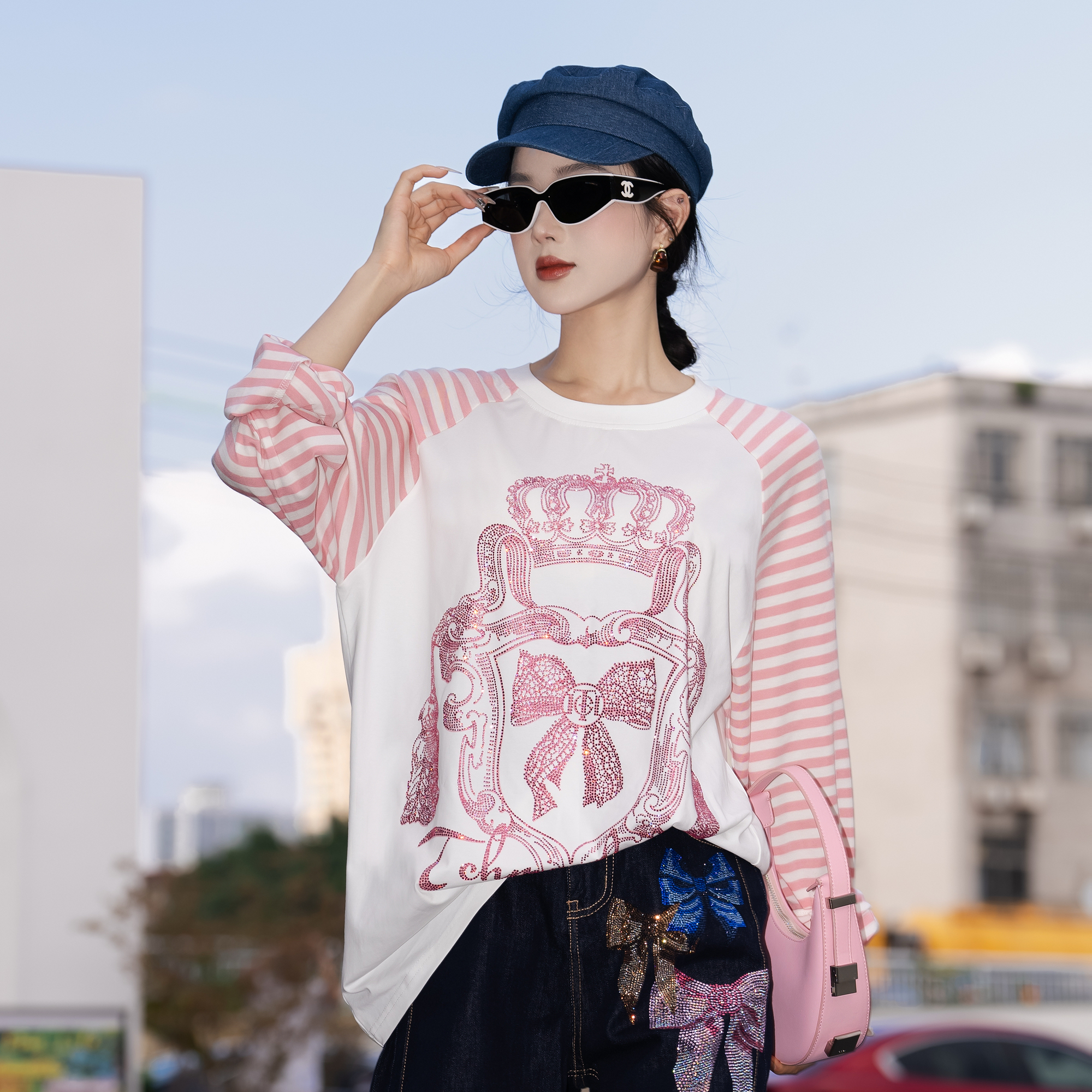 TCH轻奢潮牌烫钻早秋粉白条纹撞色休闲宽松长袖 T恤女T75C08E9021