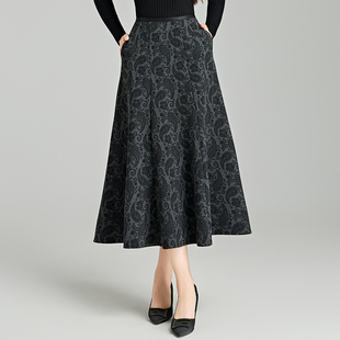 印花毛呢半身裙女秋冬新款 伞裙 高腰显瘦a字裙梨形身材遮胯中长款
