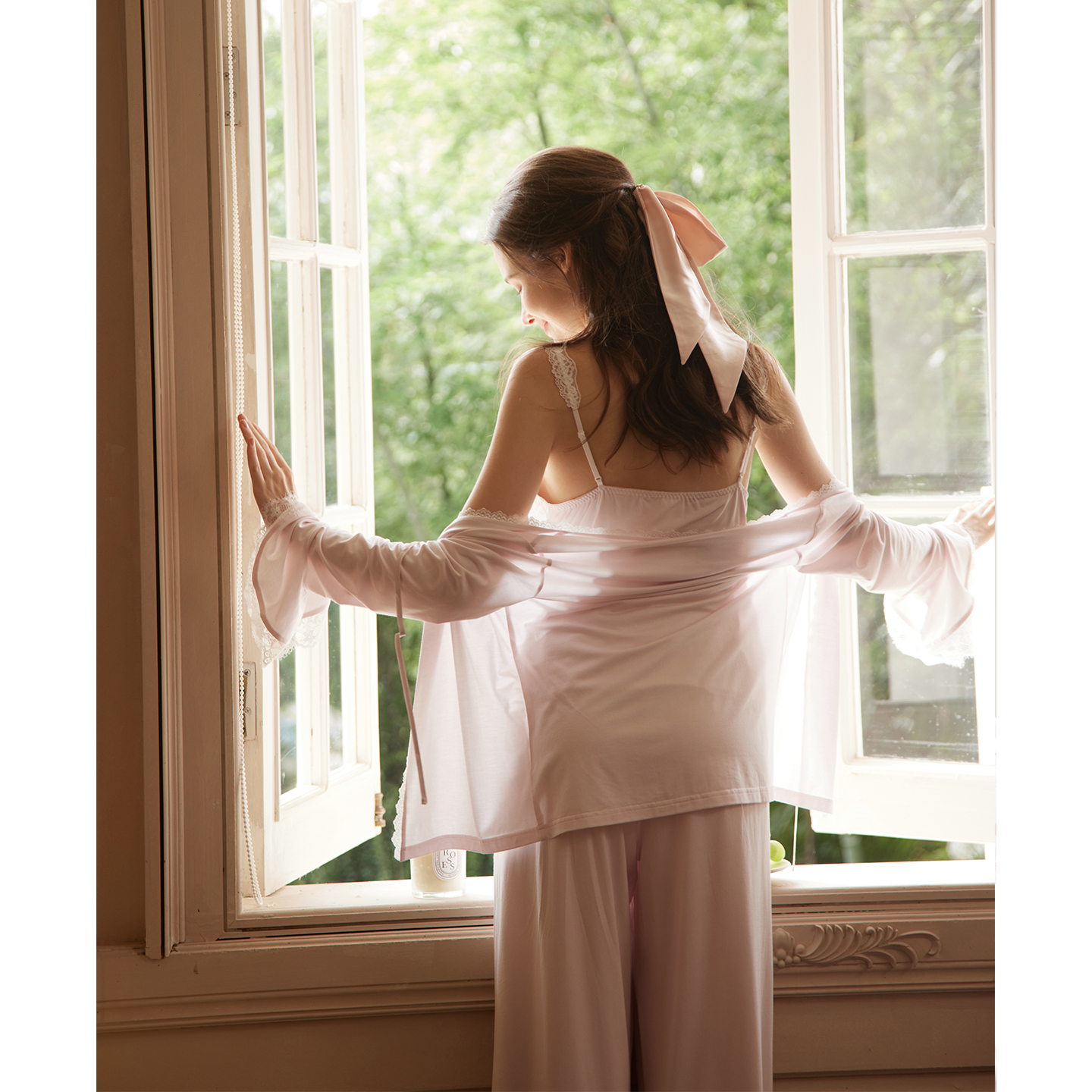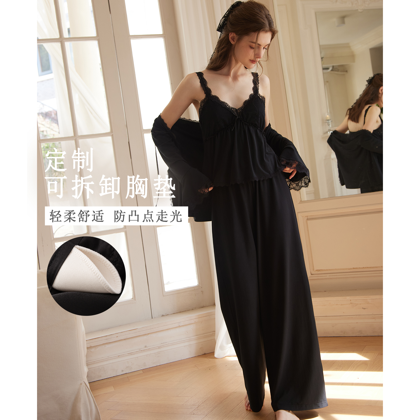 RoseTree莫代尔睡衣三件套春秋女款 黑色性感纯欲家居服带胸垫 长袖