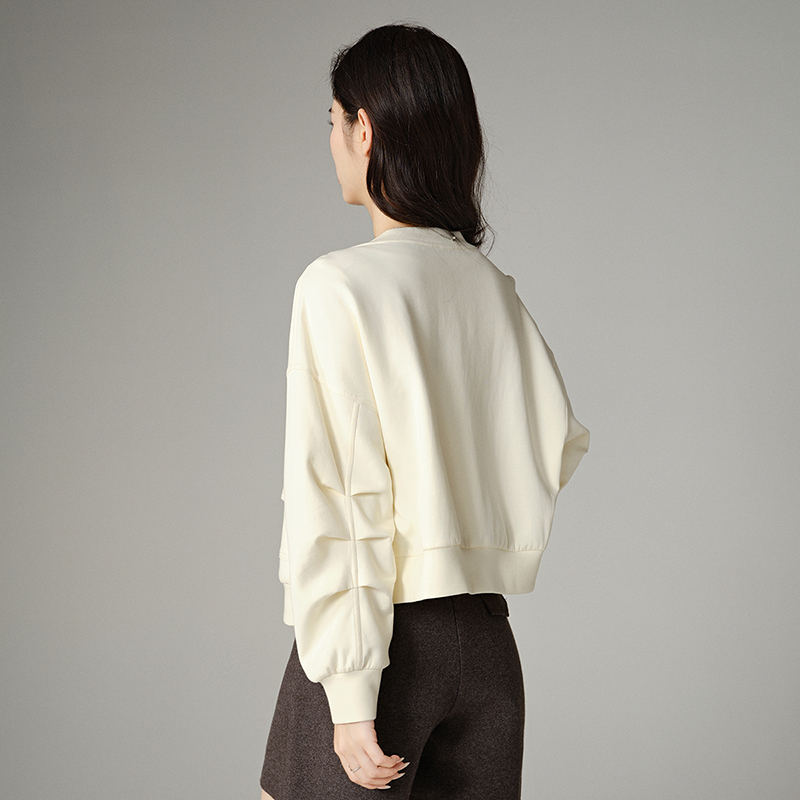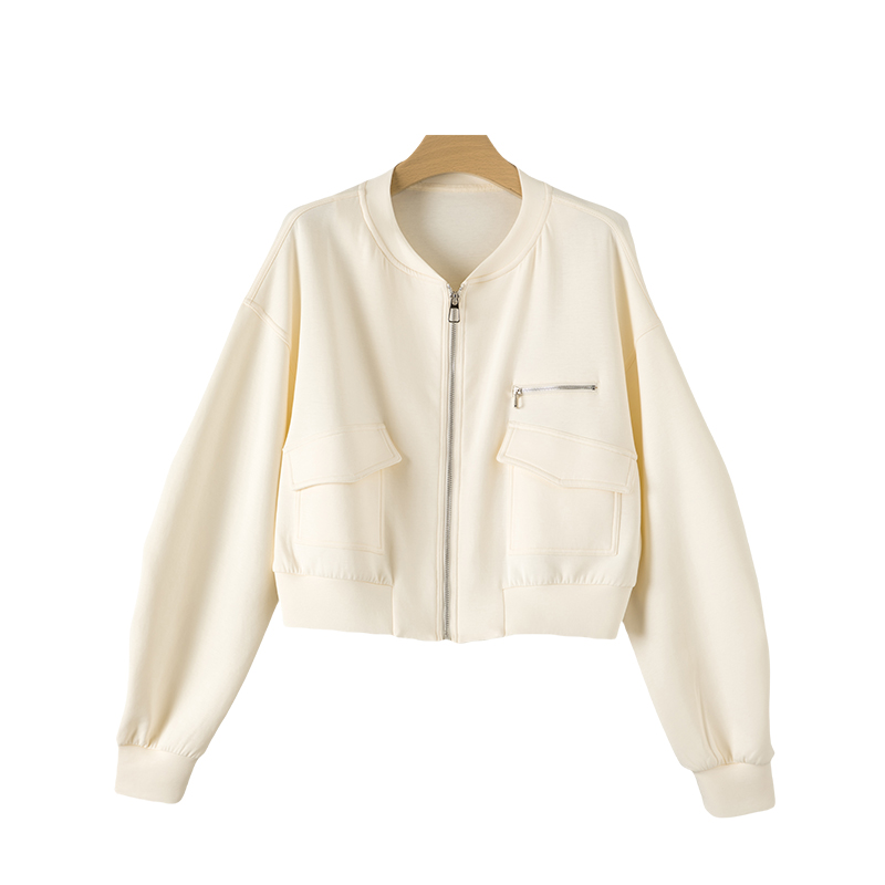 晚白2025年秋新款 棉圆领上衣纯色简约大方气质夹克外套女