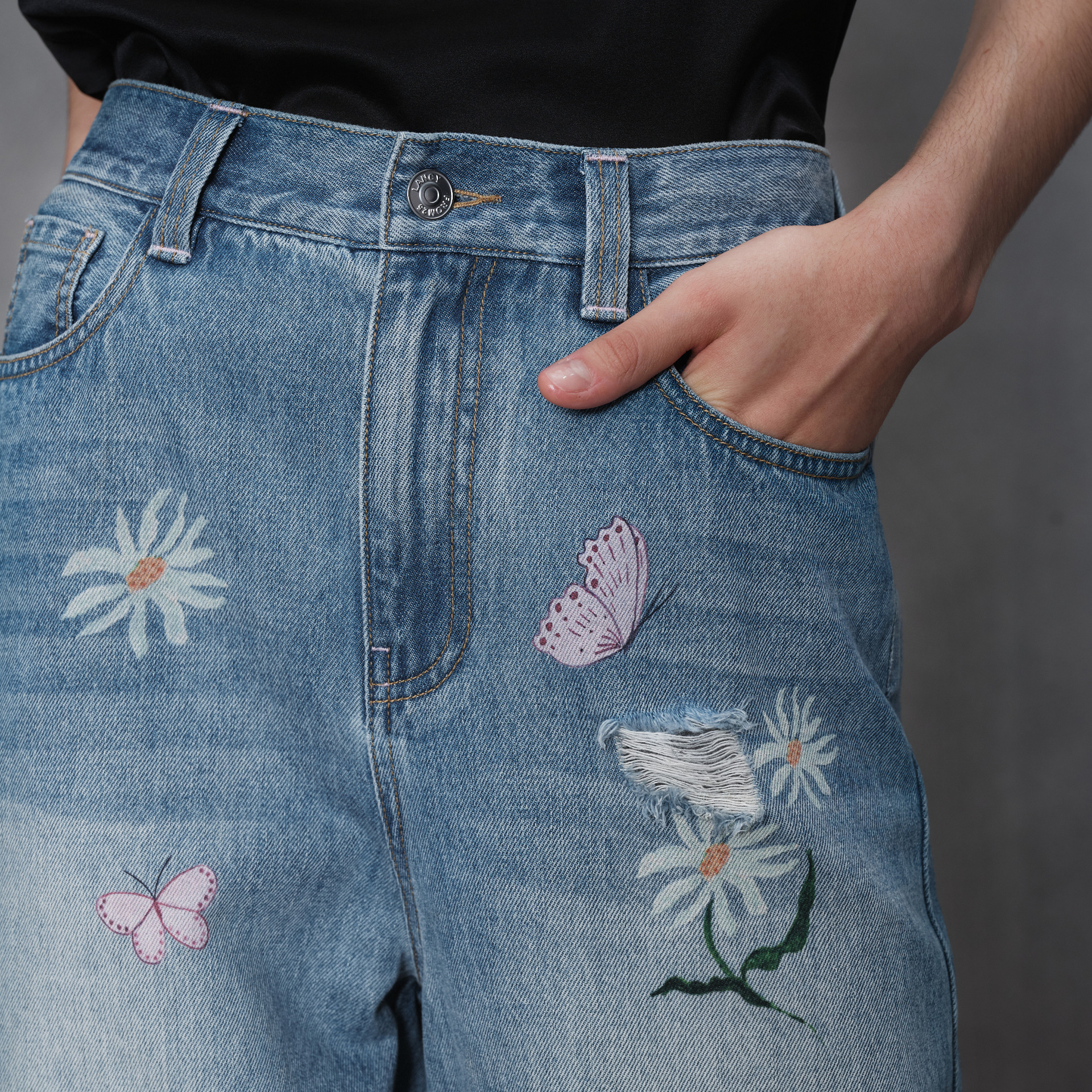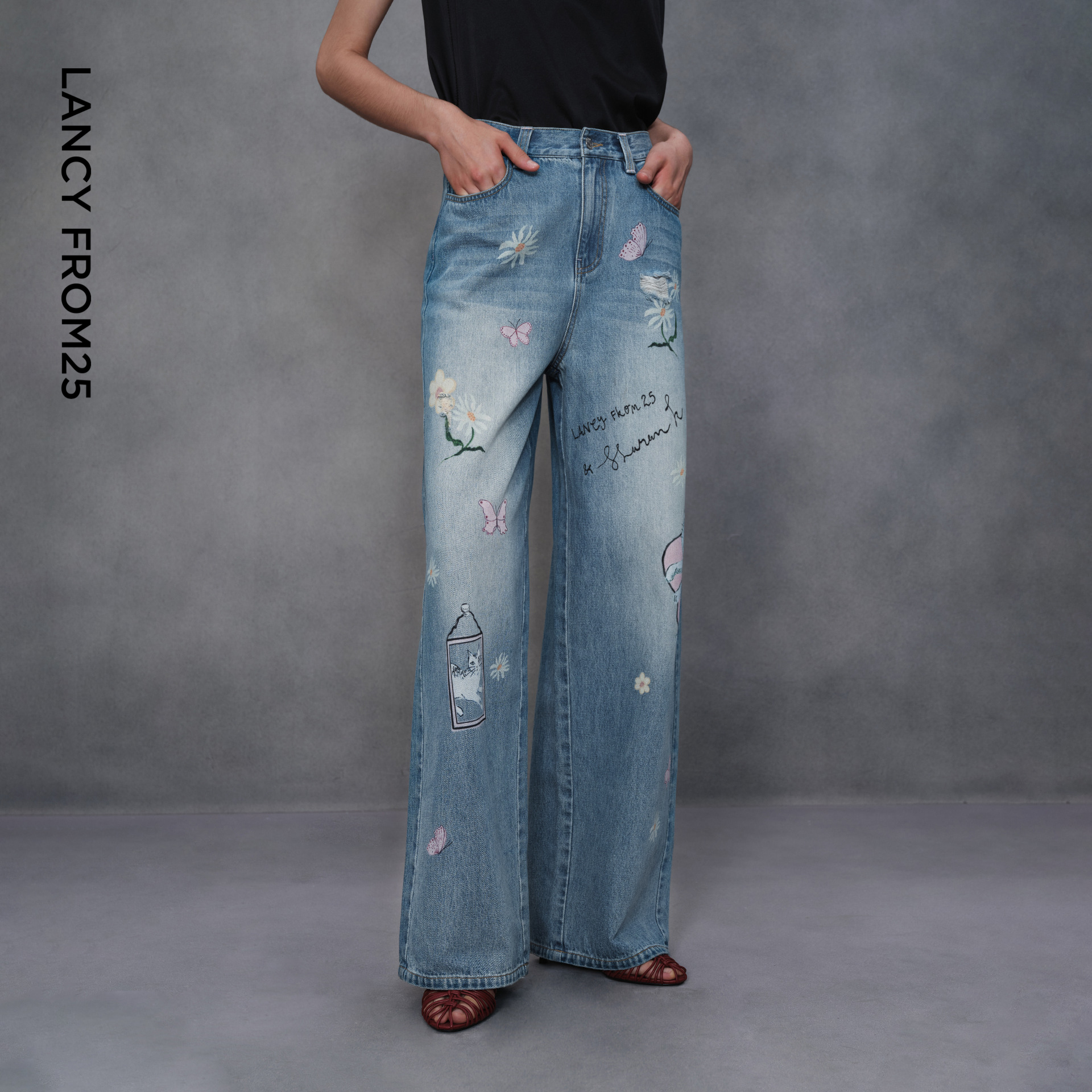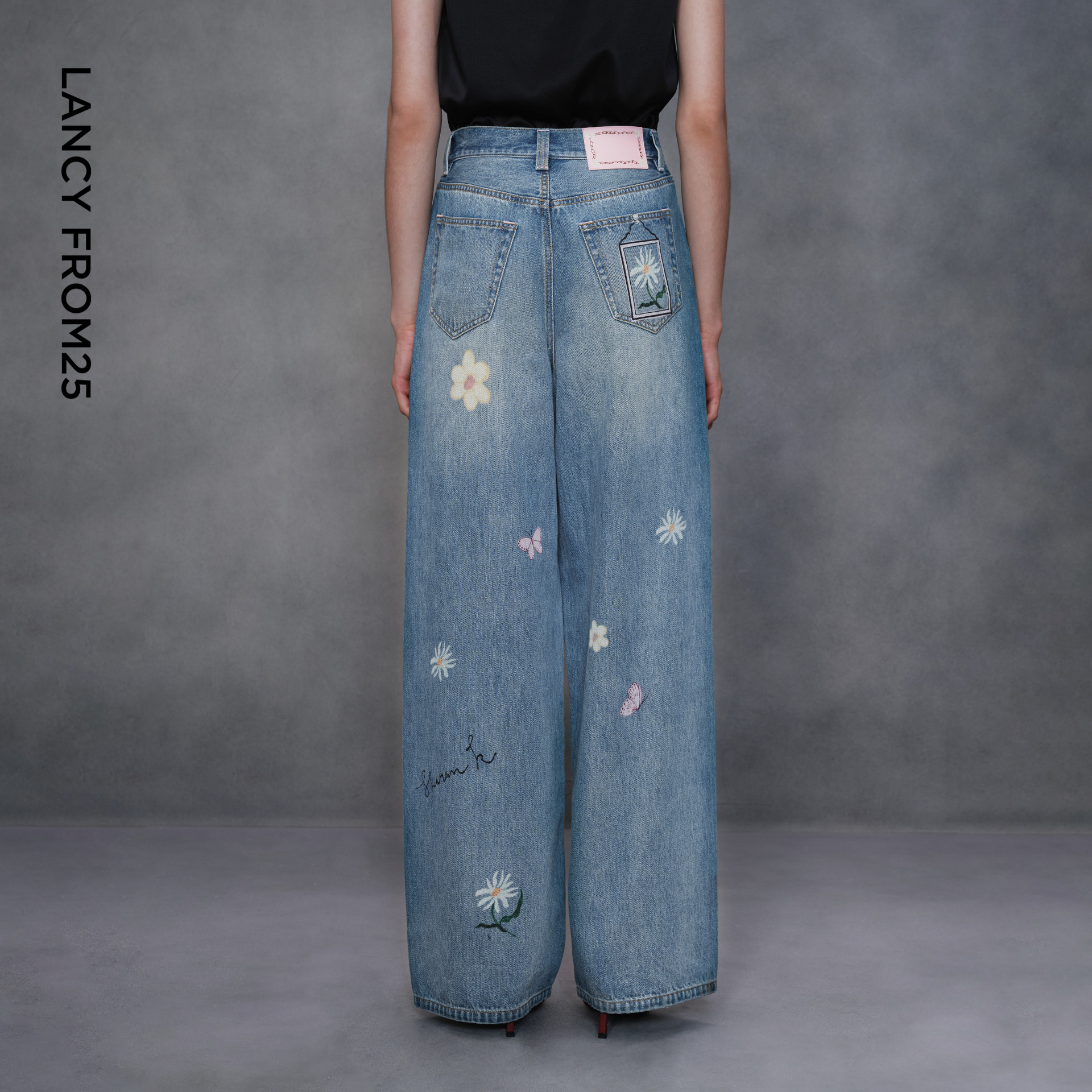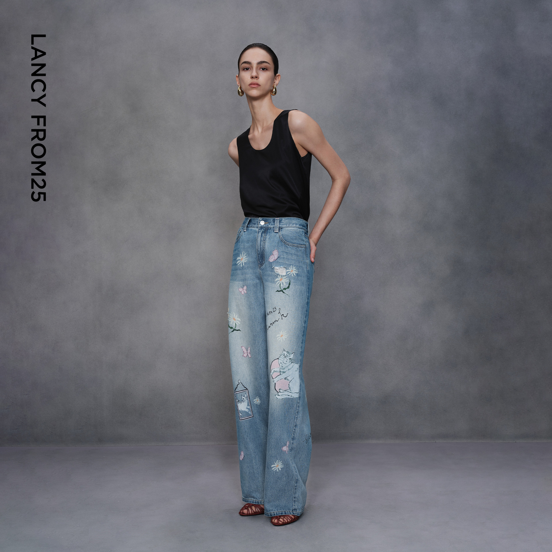 新款 2025年冬季 休闲通勤牛仔裤 艺术家联名朗姿复古水洗印花阔腿裤
