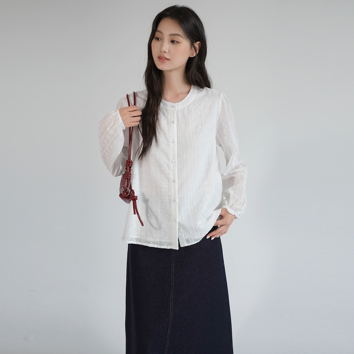 镂空绣花全棉衬衫 气质圆领灯笼袖 蓝若水大码 新款 上衣 2025秋装