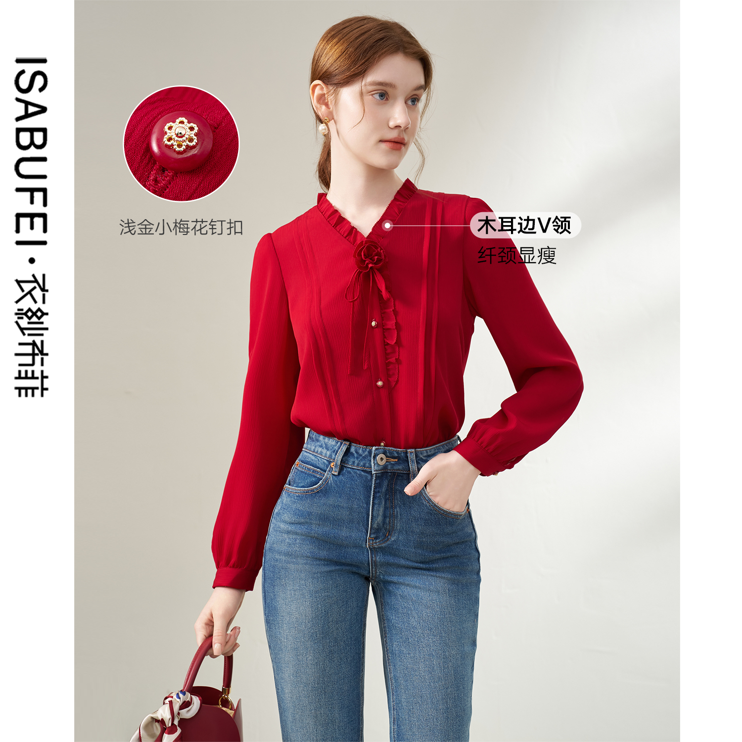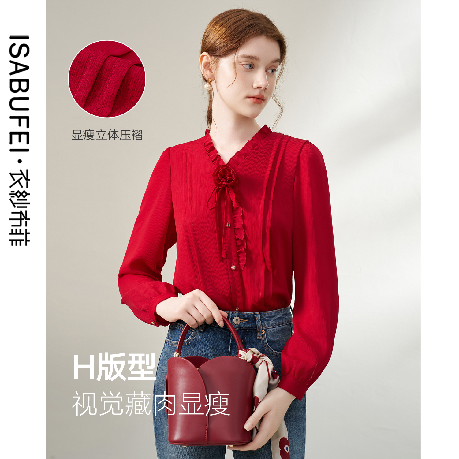 气质慵懒风褶领棉长袖 HM女装 法式 秋季 宽松衬衣1270106 花边衬衫