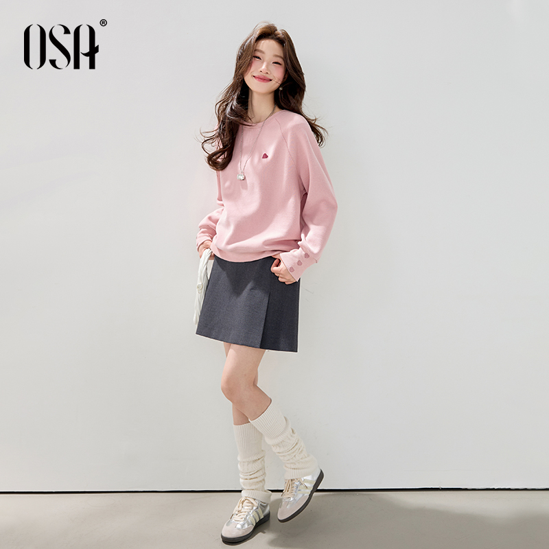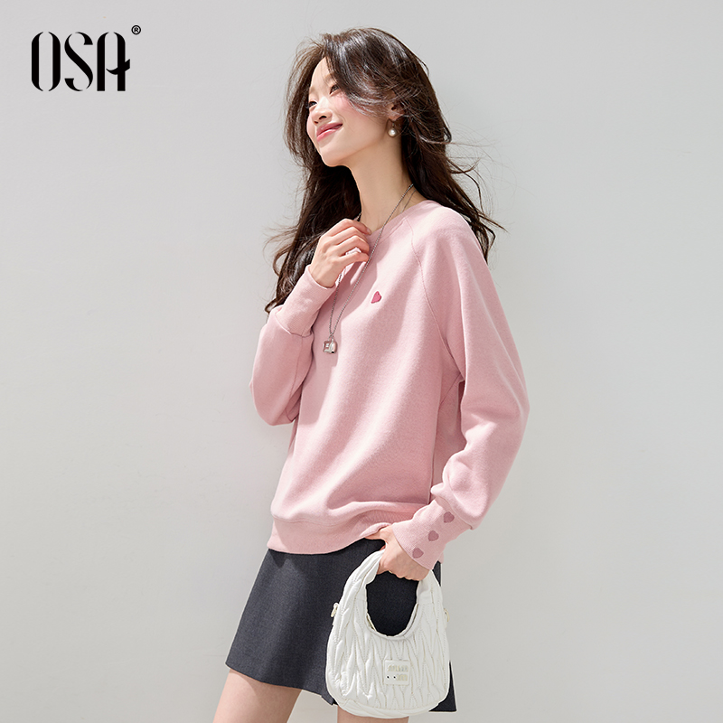 插肩袖 OSA欧莎宽松慵懒爱心刺绣卫衣女2025冬新款 圆领上衣 新品
