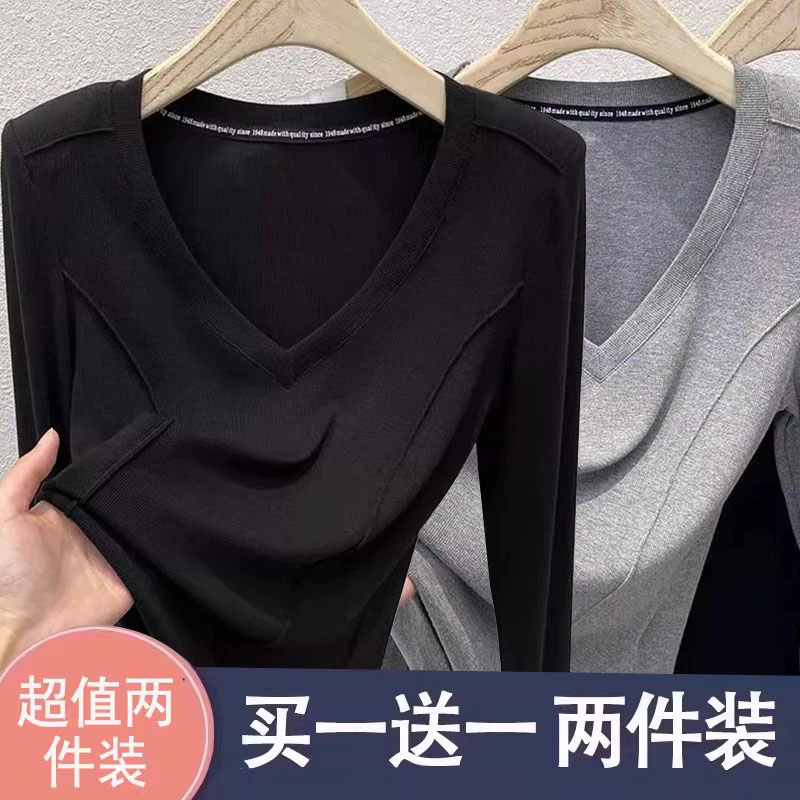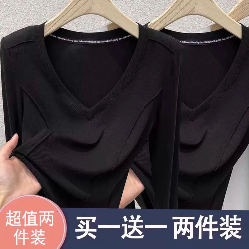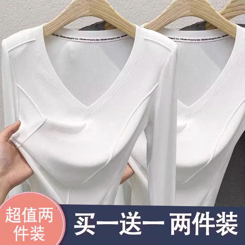 打底衫 t恤垂感修身 女内搭2025年秋季 长袖 显瘦上衣 新款 正肩V领长袖