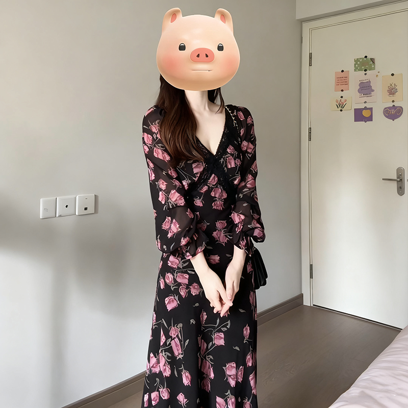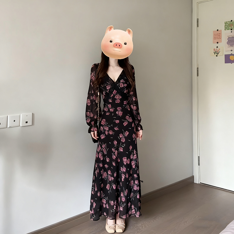 菲梦伊印花黑色连衣裙女秋装 复古褶皱设计感高腰轻熟气质V领长裙
