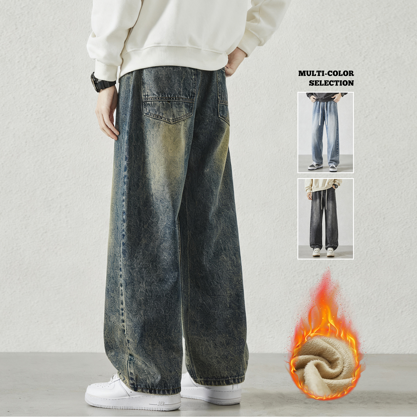 男宽松直筒2025秋冬潮牌高街加绒加厚水洗休闲阔腿长裤 美式 牛仔裤