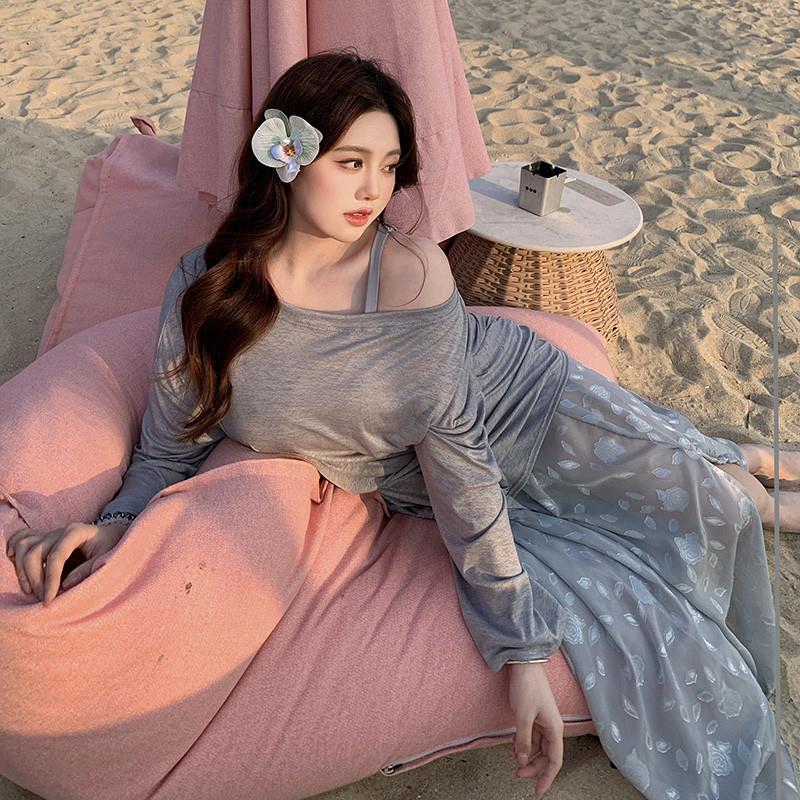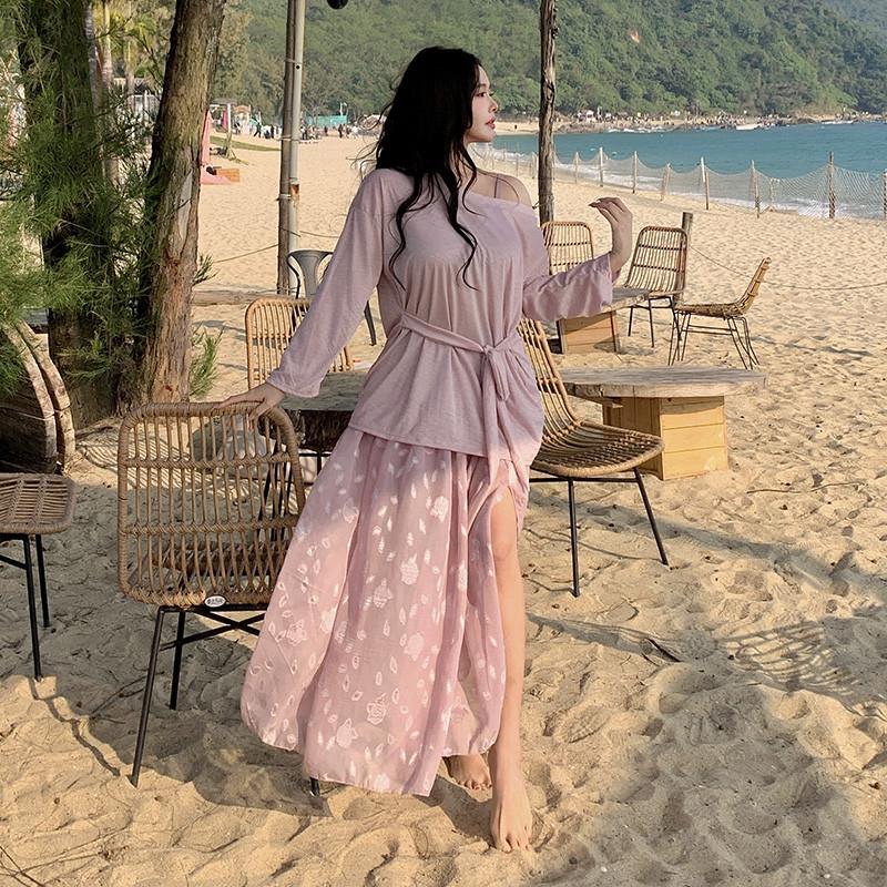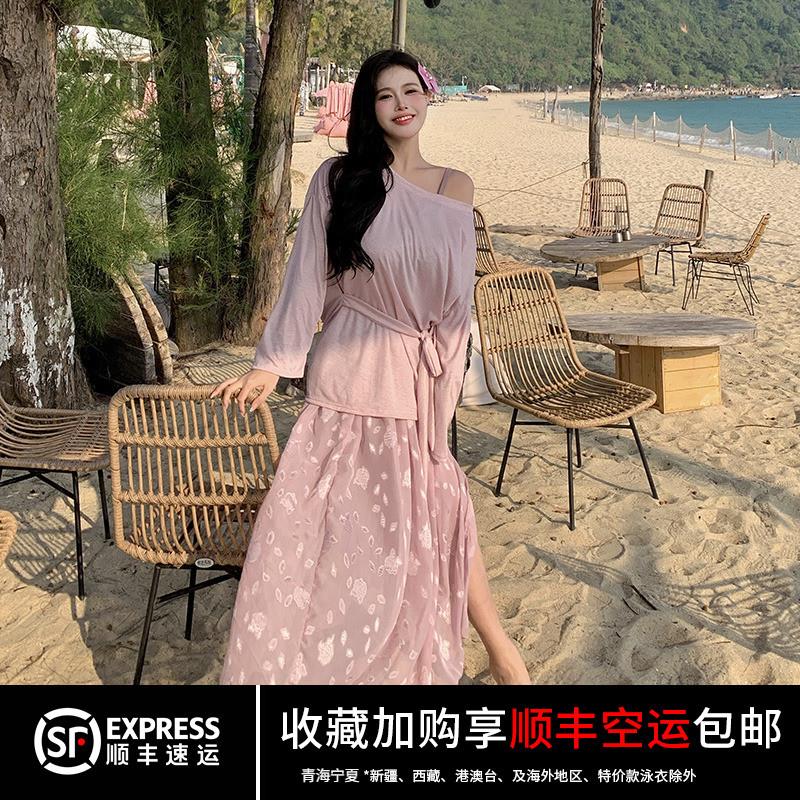海边度假拍照好看大码 高货速发泳衣女比基尼性感分体裙长袖 罩衫