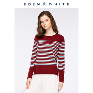 圣雪绒100%山羊绒女圆领日系可爱设计条纹针织套衫