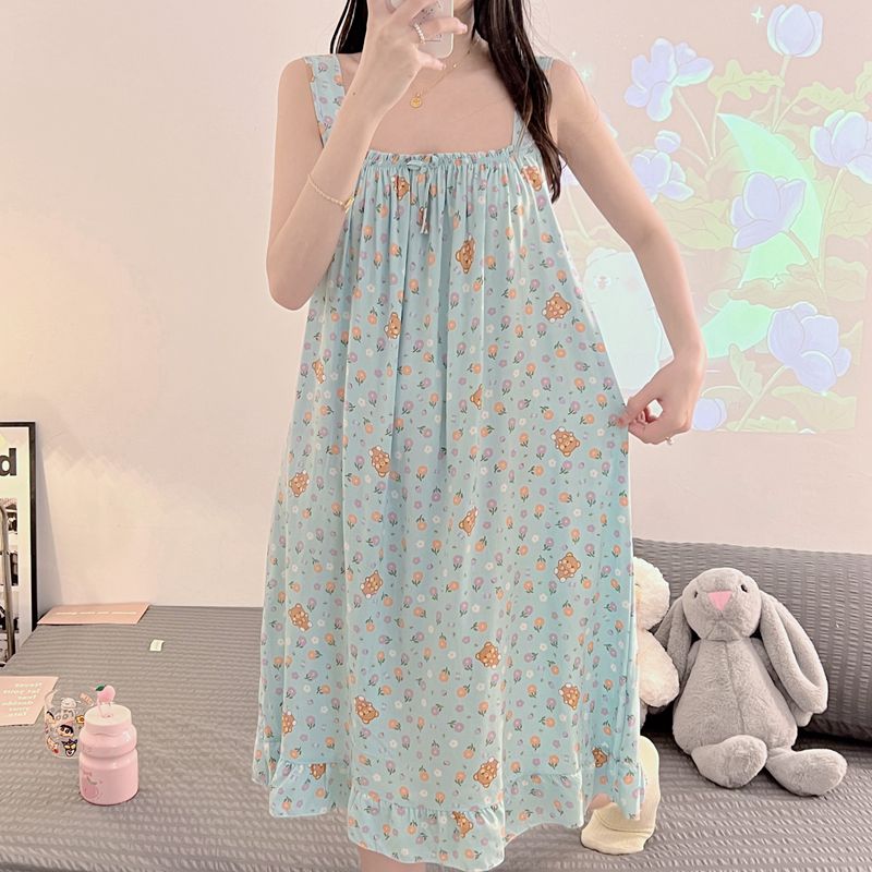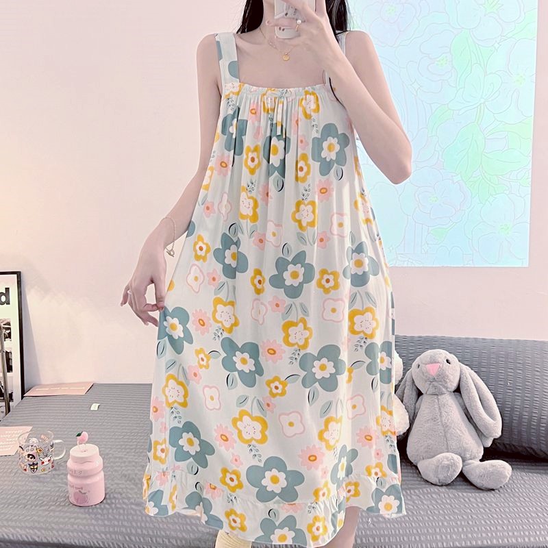 薄款 吊带睡裙女夏棉绸睡衣短袖 绵绸学生人造棉连衣裙胖MM加肥大码