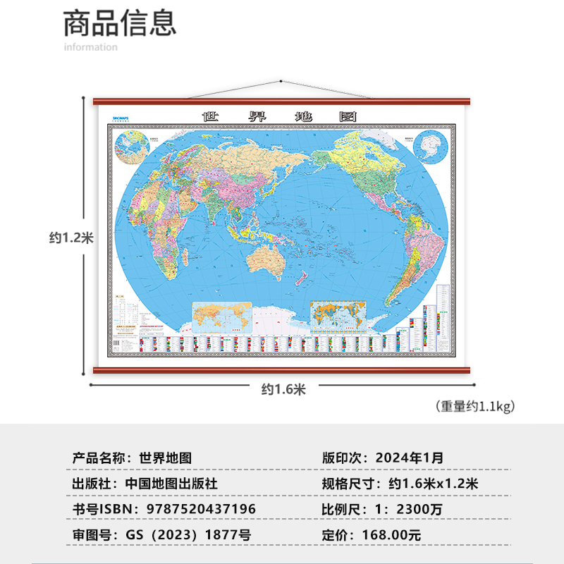 双全开无拼接 书房高端挂图 世界地图挂图 教室 商务 办公 防红木精品挂图 高1.2米 宽1.6米 2024全新版 版