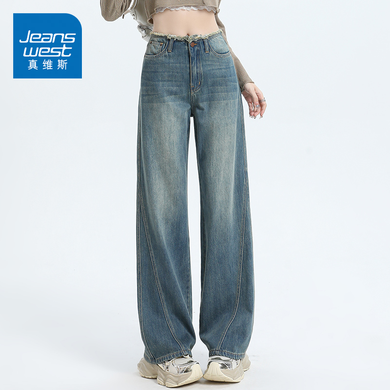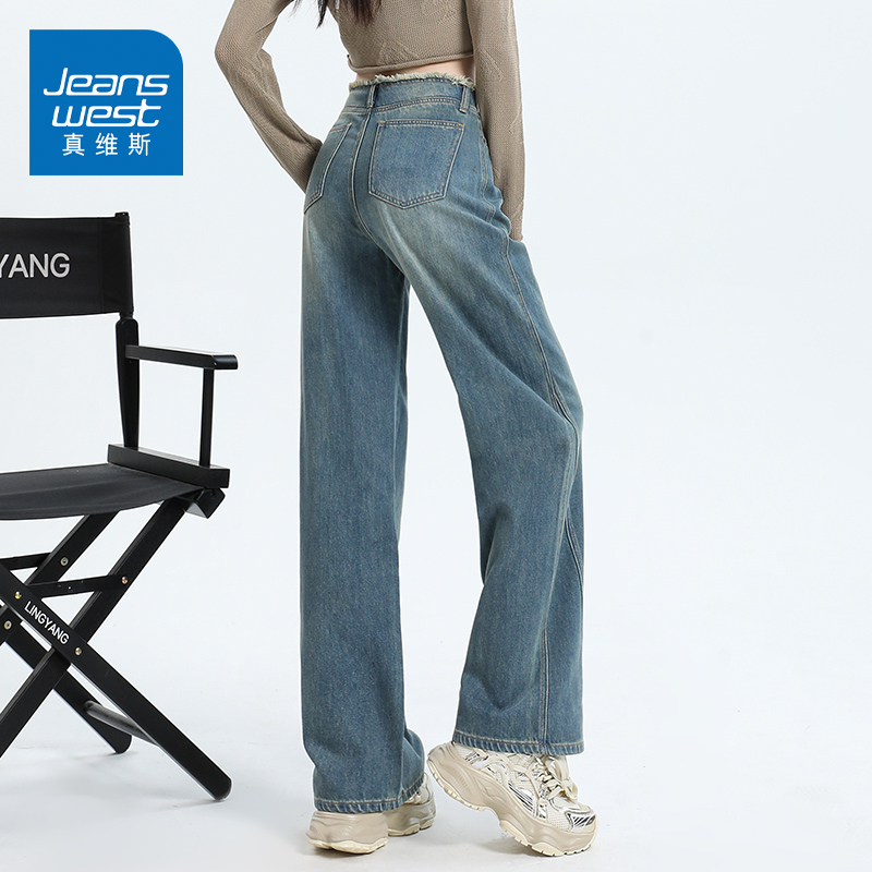 休闲显瘦长裤 新款 子 女2025秋季 阔色蓝色复古纯棉直筒水洗牛仔裤
