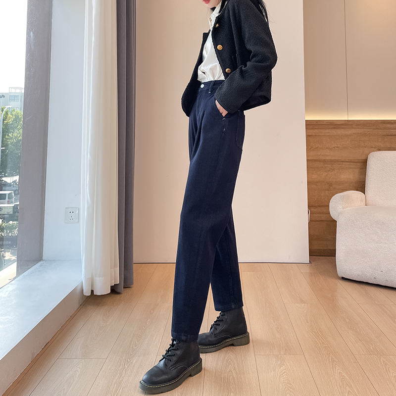 薄绒加厚高腰直筒宽松显瘦萝卜哈伦老爹裤 加绒卷边牛仔裤 女春秋季