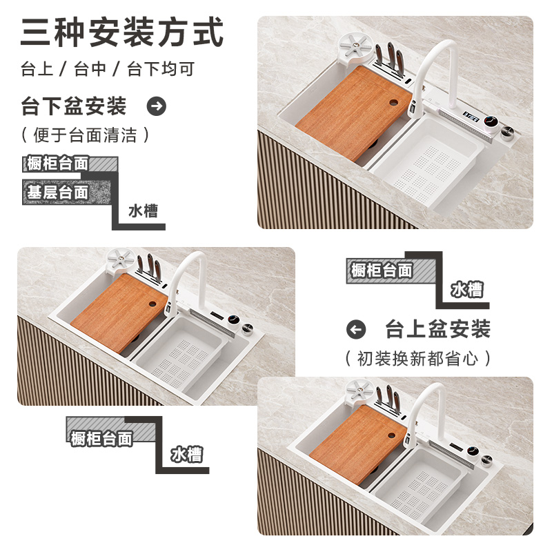 左侧下水氛围灯数显瀑布水槽白色304不锈钢洗菜盆大单槽刀架