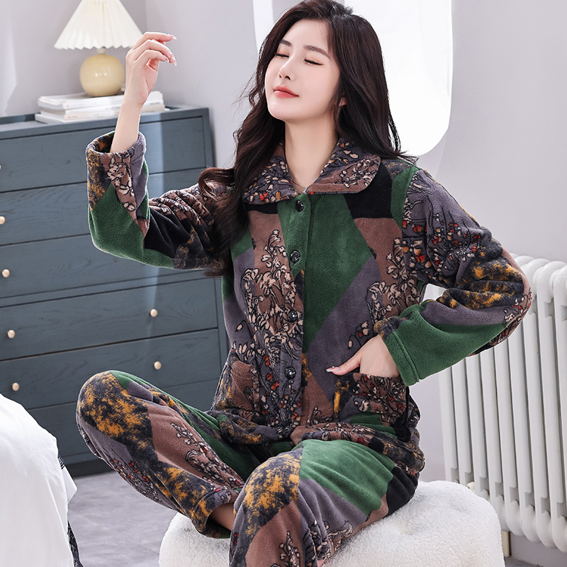 女士法兰绒家居服套装 中老年妈妈装 珊瑚绒睡衣女冬加厚大码 秋冬季