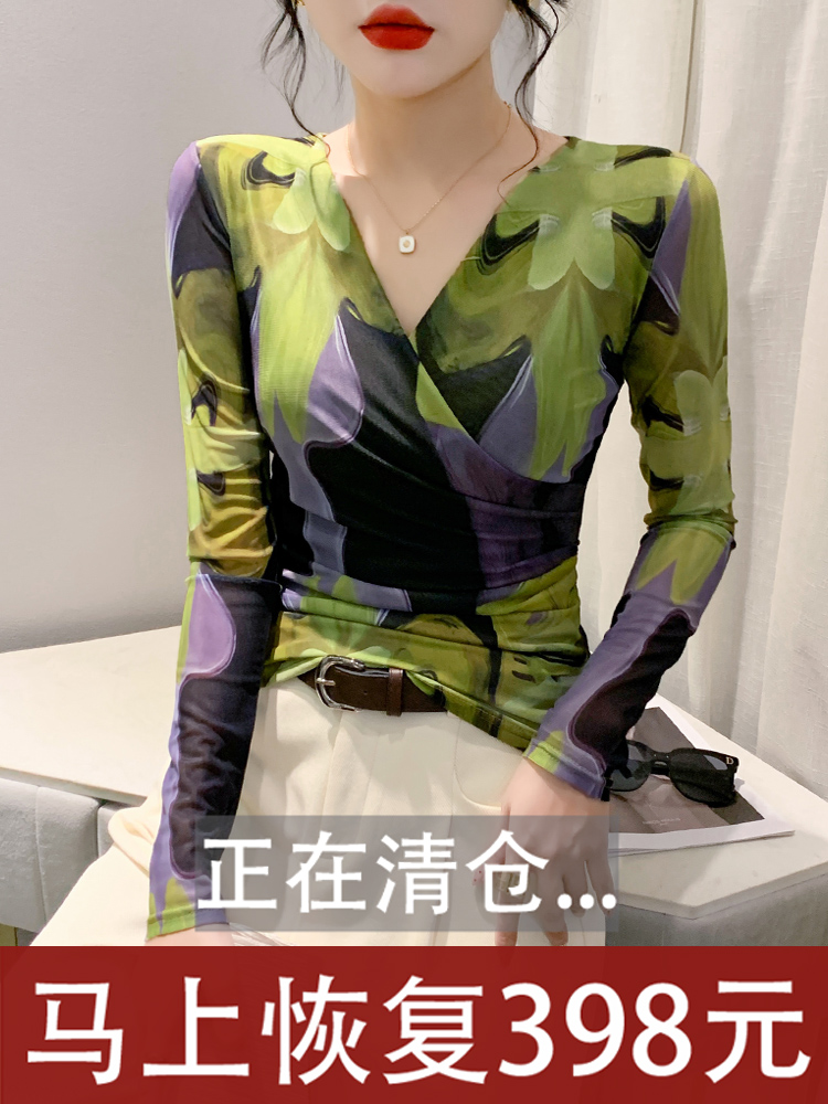 高级感显瘦洋气小衫 气质交叉V领T恤女长袖 网纱打底衫 新款 上衣秋装