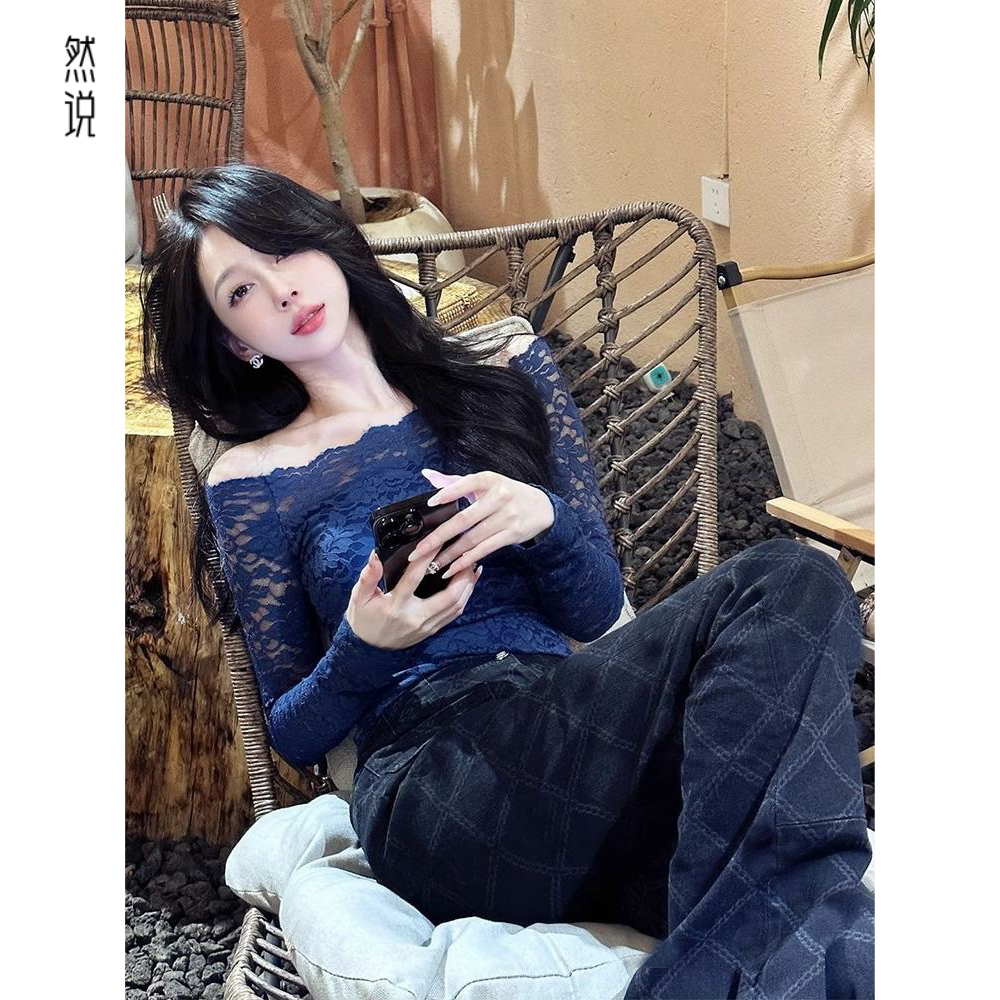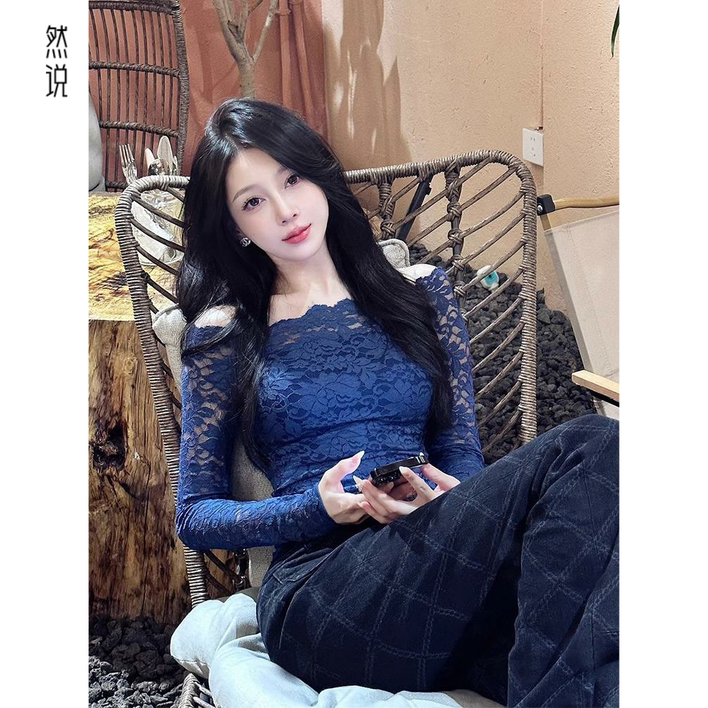 内搭女秋冬 一字领上衣高级感蓝色蕾丝打底衫 2025新款 独特别致小衫