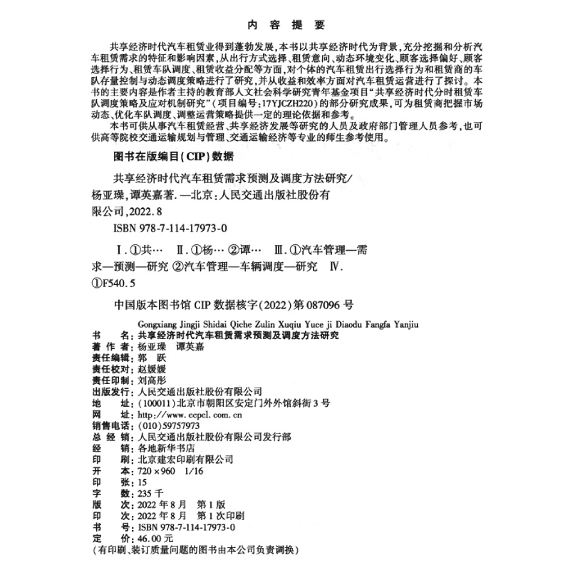 共享经济时代汽车租赁需求预测及调度方法研究9787114179730人民交通出版 社