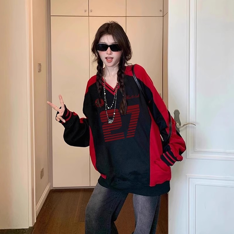 V领拼色秋冬卫衣设计感韩系慵懒风ins潮大码 小众撞色显瘦外套上衣