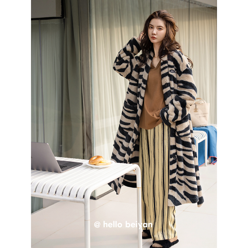 贝妍珊瑚绒睡衣女秋冬款 高级感斑马纹性感浴袍加厚保暖法兰绒睡袍