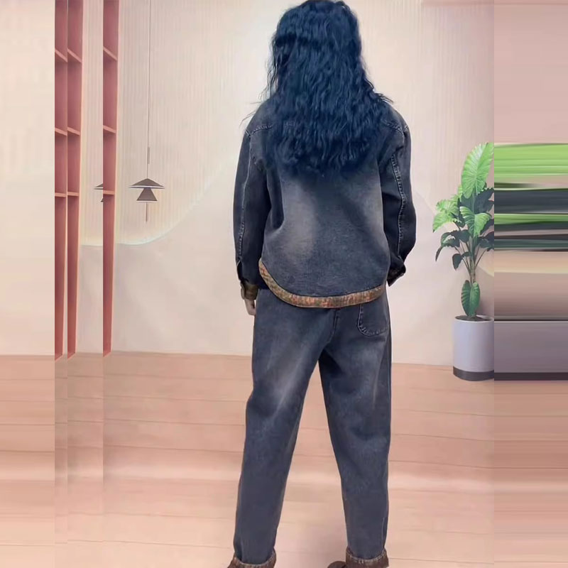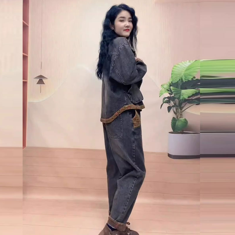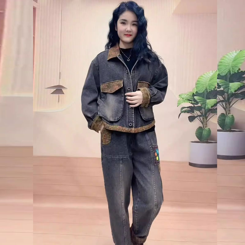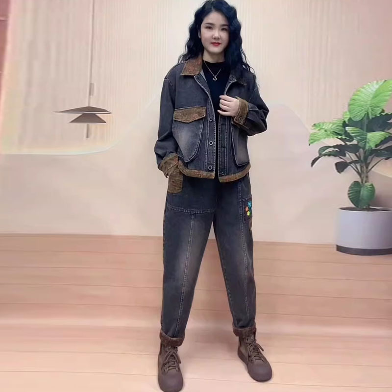 套装 炒色口袋哈伦裤 潮 刺绣牛仔两件套女秋冬新款 加棉加厚复古大码