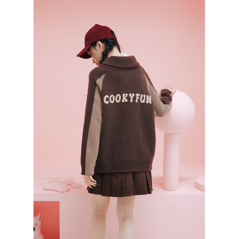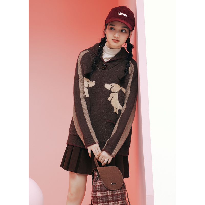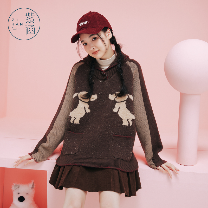 小狗提花原创小众套头毛衫 新款 上衣 毛衣女冬季 紫涵连帽休闲针织衫