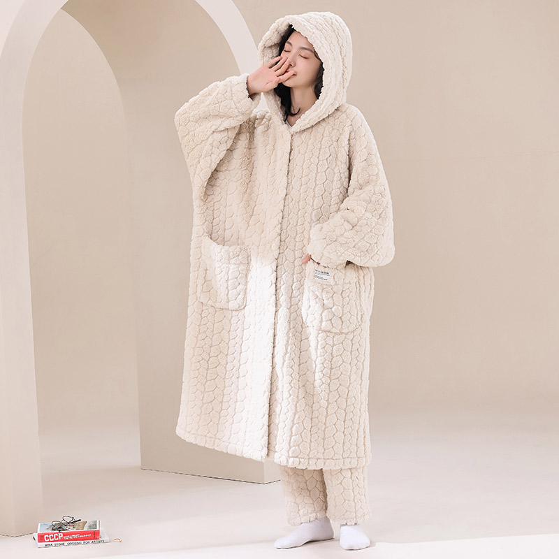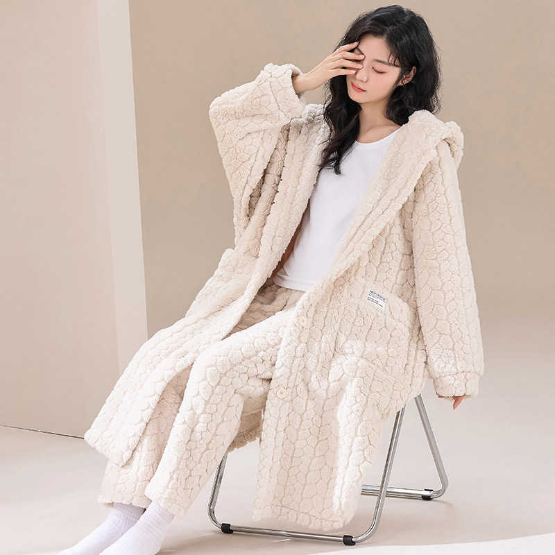 女士睡衣 2025新款 睡袍女秋冬季 珊瑚绒加绒加厚连帽浴袍保暖长款