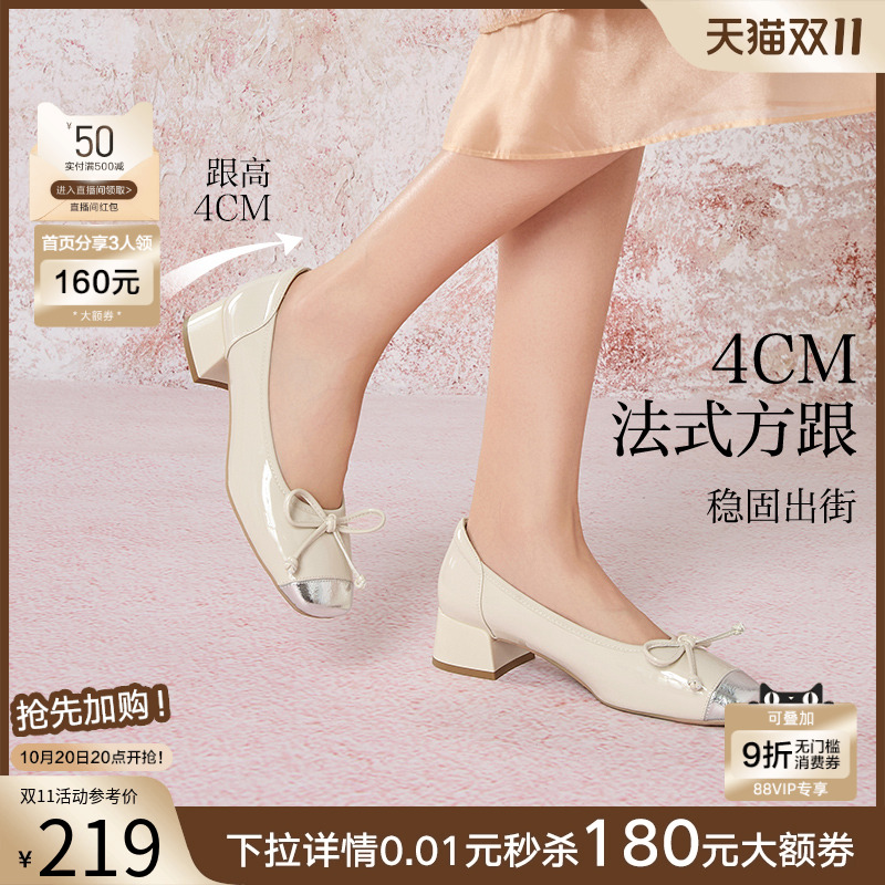 W6791AQ5 蝴蝶结懒人一脚蹬粗跟方头女单鞋 百思图2025春季 商场新款