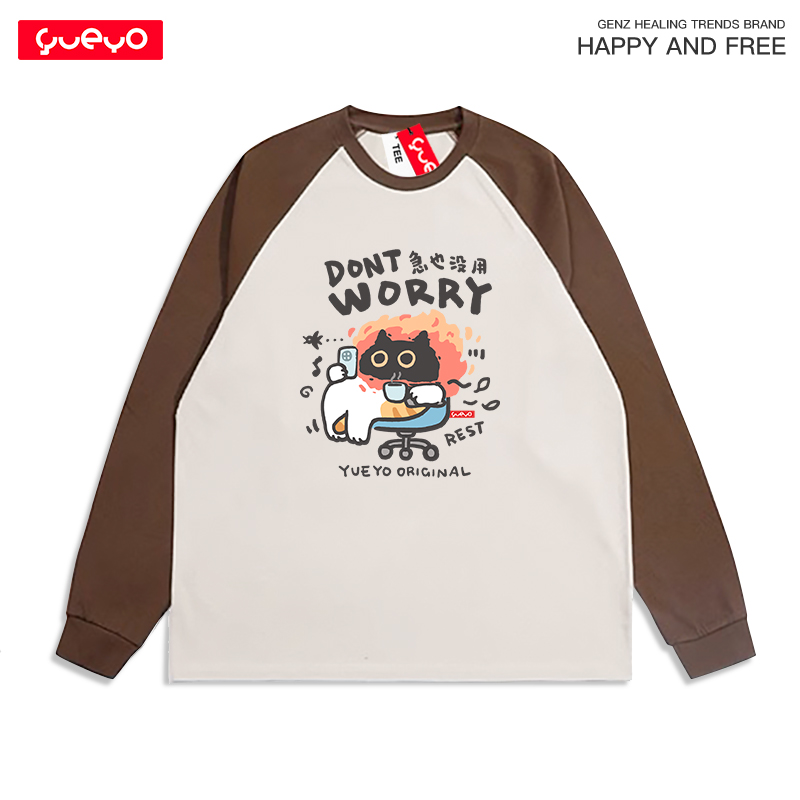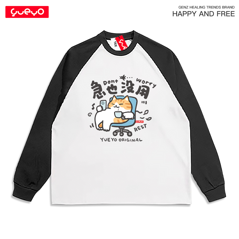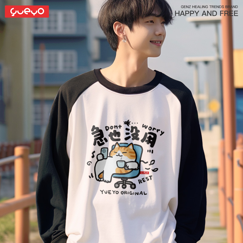 T恤男纯棉宽松插肩 2025秋重磅260g猫咪拼色长袖 悦游 急也没用