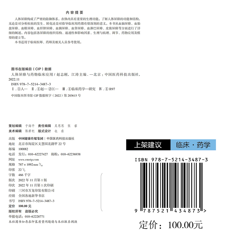 人体屏障与药物临床应用 中国医药科技出版 赵志刚 主编 社9787521434873 江涛 现货正版