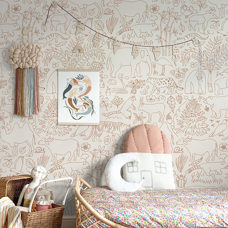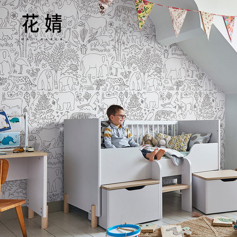现代儿童房线条动物墙布墙纸定制壁画北欧风格 卧室温馨背景墙壁纸