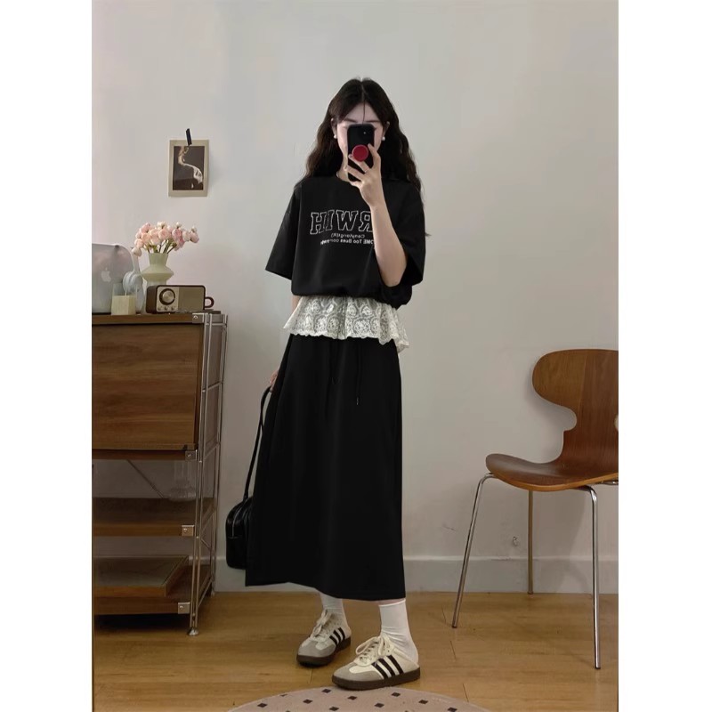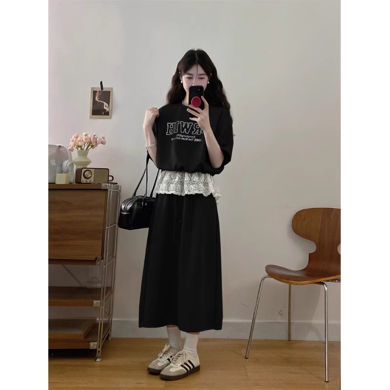 蕾丝上衣女装 夏季 胖MM遮肚显瘦半身裙子两件套 设计感休闲套装 大码