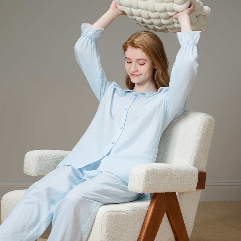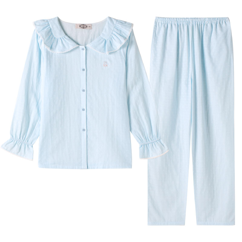 女春秋双层棉纱甜美刺绣全棉质家居服夏 纯棉睡衣套装 美标新款 长袖