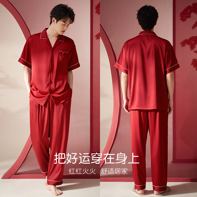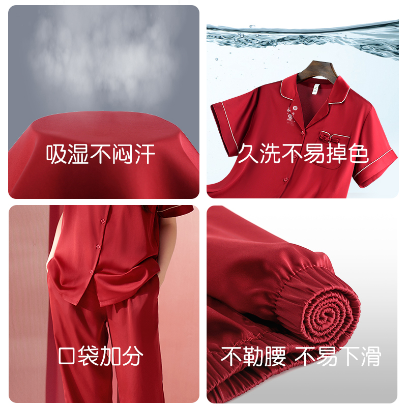 冰丝绸短袖 家居服套装 长裤 结婚男士 新中式 轩靓情侣红色睡衣女夏季