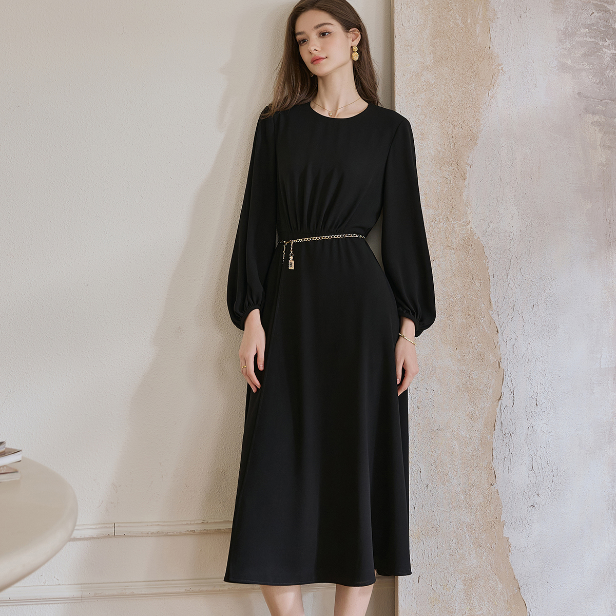 优雅蕾丝拼接中长款 黑色长袖 时尚 新款 开叉裙子 连衣裙女2025年秋季