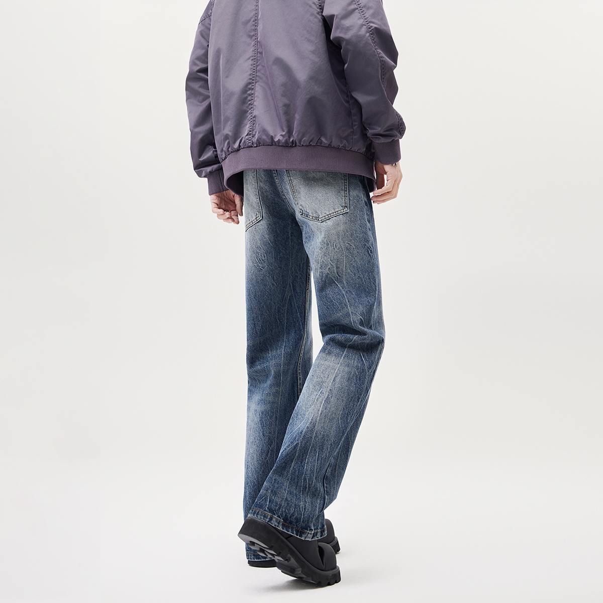 JFU2025秋冬复古水洗直筒牛仔裤 男女高街设计感宽松阔腿坠感长裤