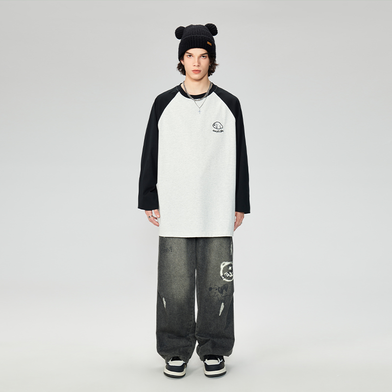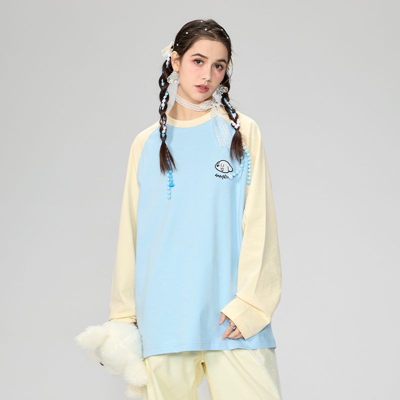 情侣装 新款 拼色百搭打底上衣 T恤男春季 LAMLICKA简约小狗绣花长袖