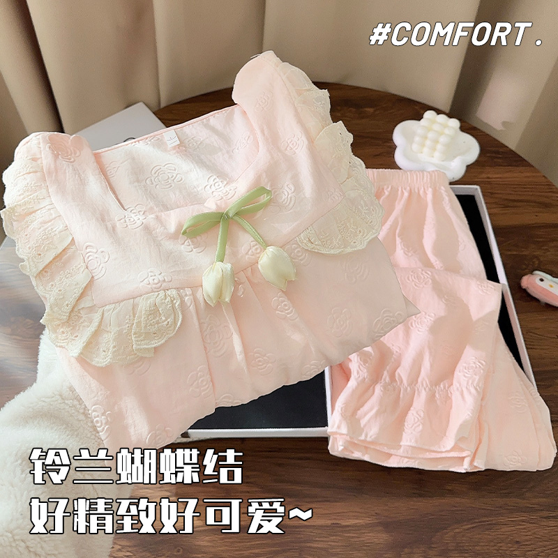 带胸垫云朵棉睡衣女 新款 甜美公主风铃兰蝴蝶结家居服套装 2025春季