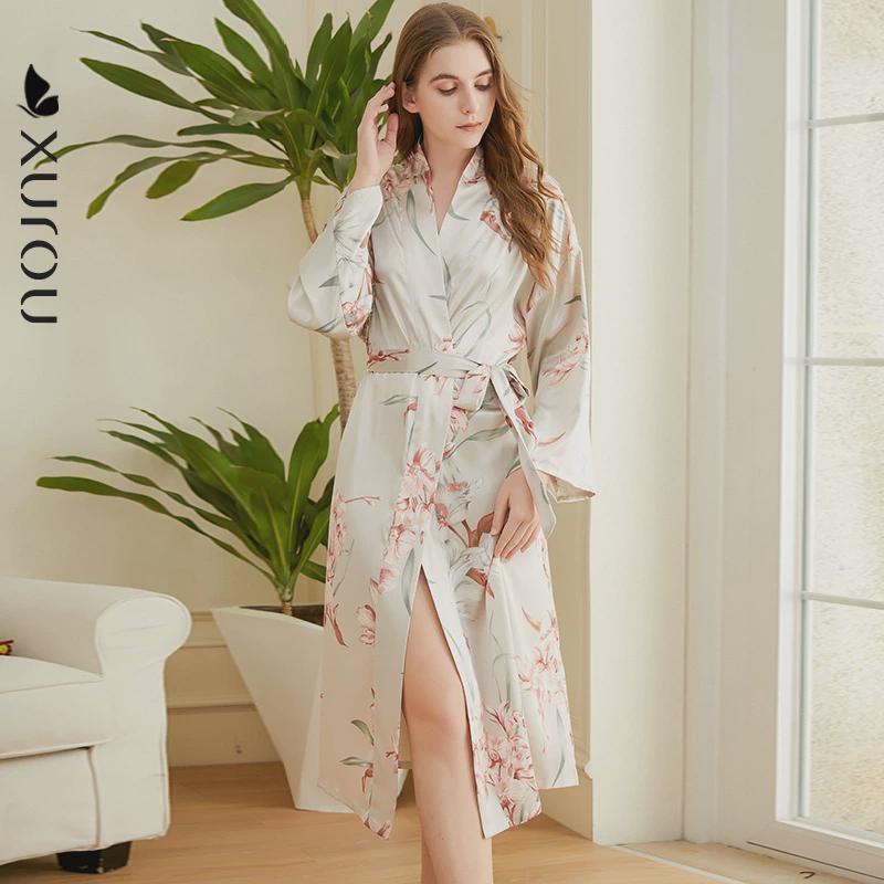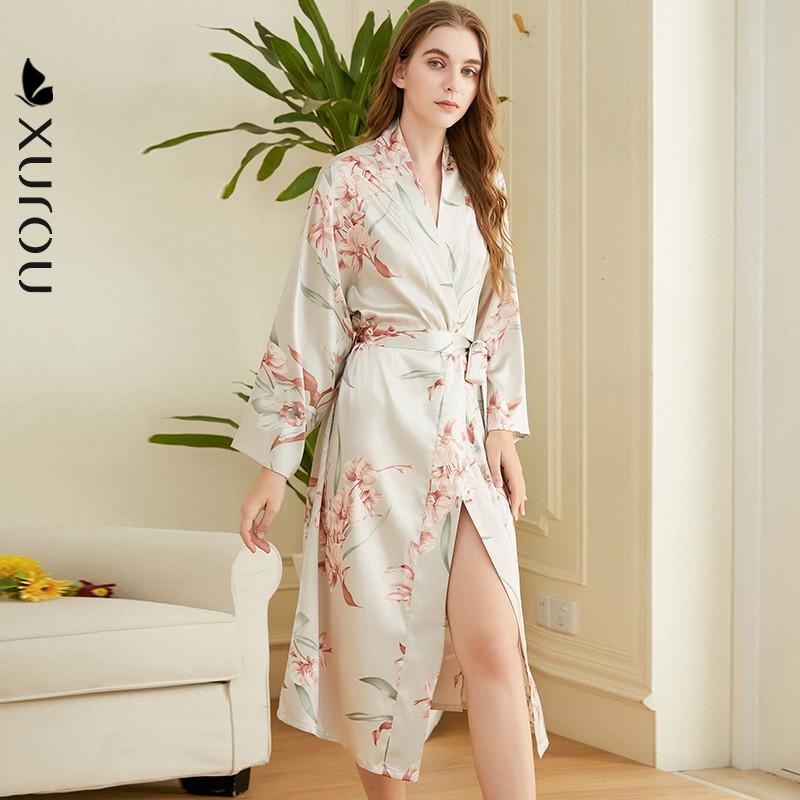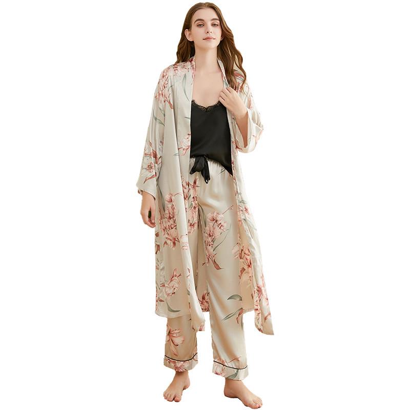浴袍套装 薄冰丝绸家居服长裤 睡袍女长袖 睡衣女春夏性感蕾丝中长款