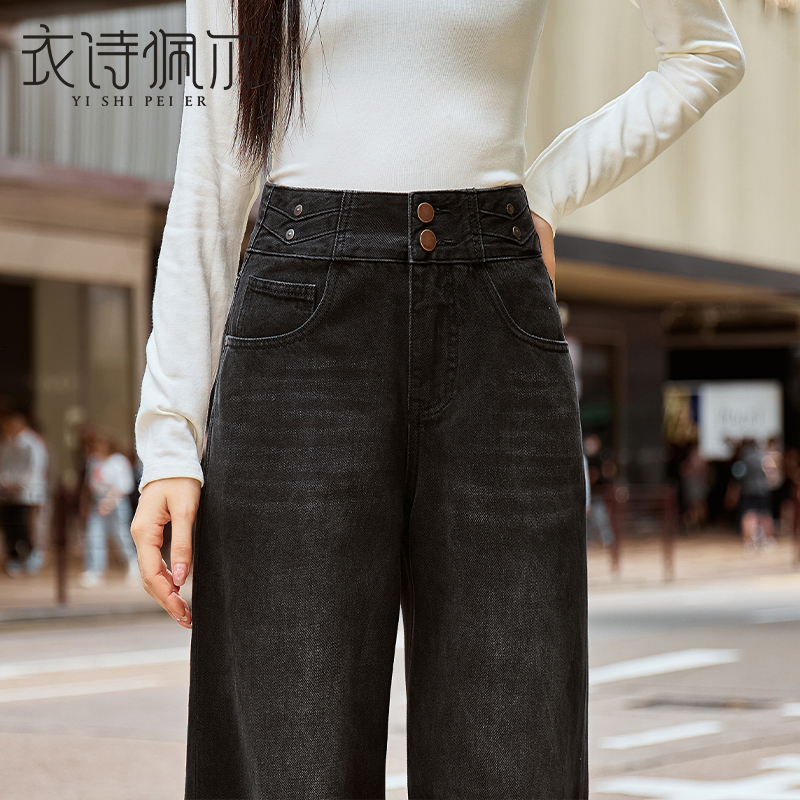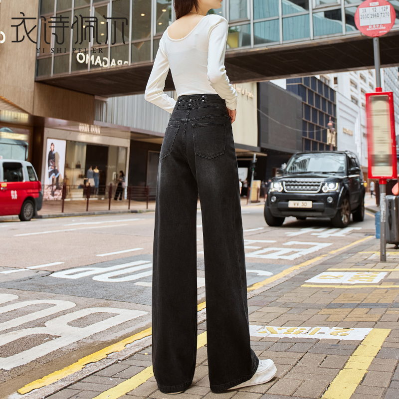 高腰显瘦宽松拖地直筒裤 黑色厚绒窄版 新款 女2025年夏季 阔腿牛仔裤